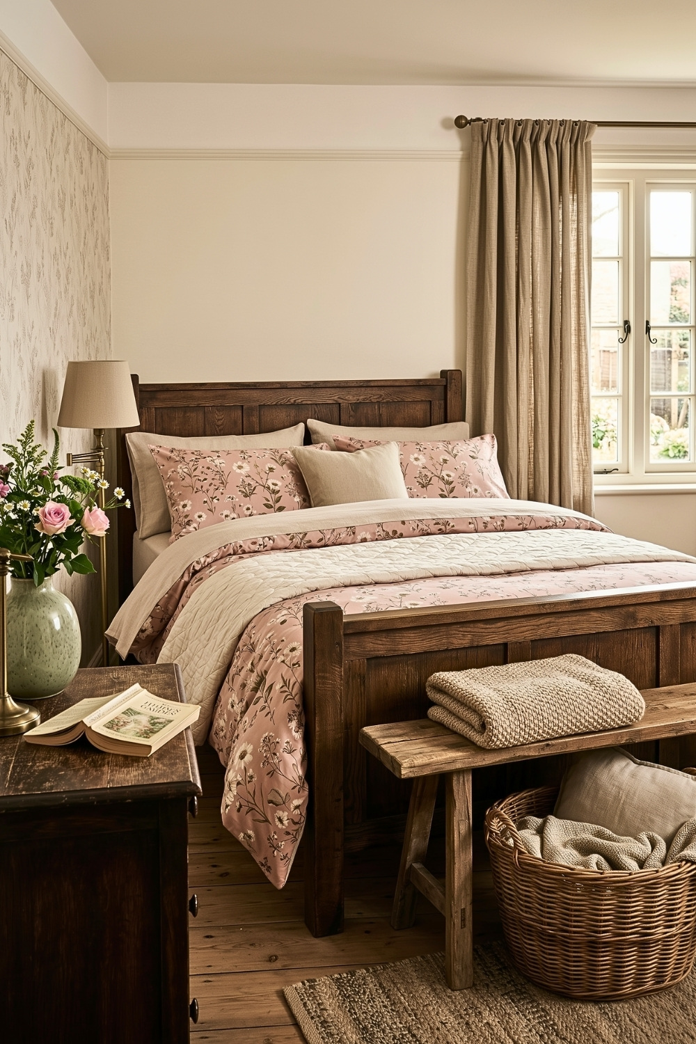 I really love how the dark brown furniture anchors the soft pink bedding in this specific setup. Finding a balance between rustic and delicate can be hard, but the natural wood bench and woven carpet make the whole space feel grounded. If you’re looking for earthy cottage ideas, this mix of textures is a perfect place to start.