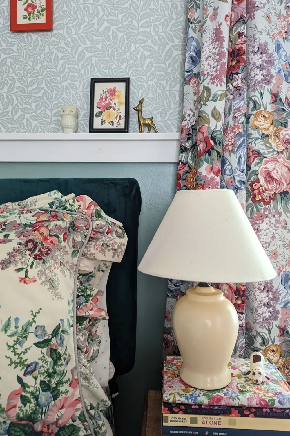 u/lselvagn really captured a nostalgic English cottage aesthetic by using affordable floral wallpaper and custom green wainscoting. I love how they added a velvety slipcover for a bit of extra texture while staying within a modest budget.