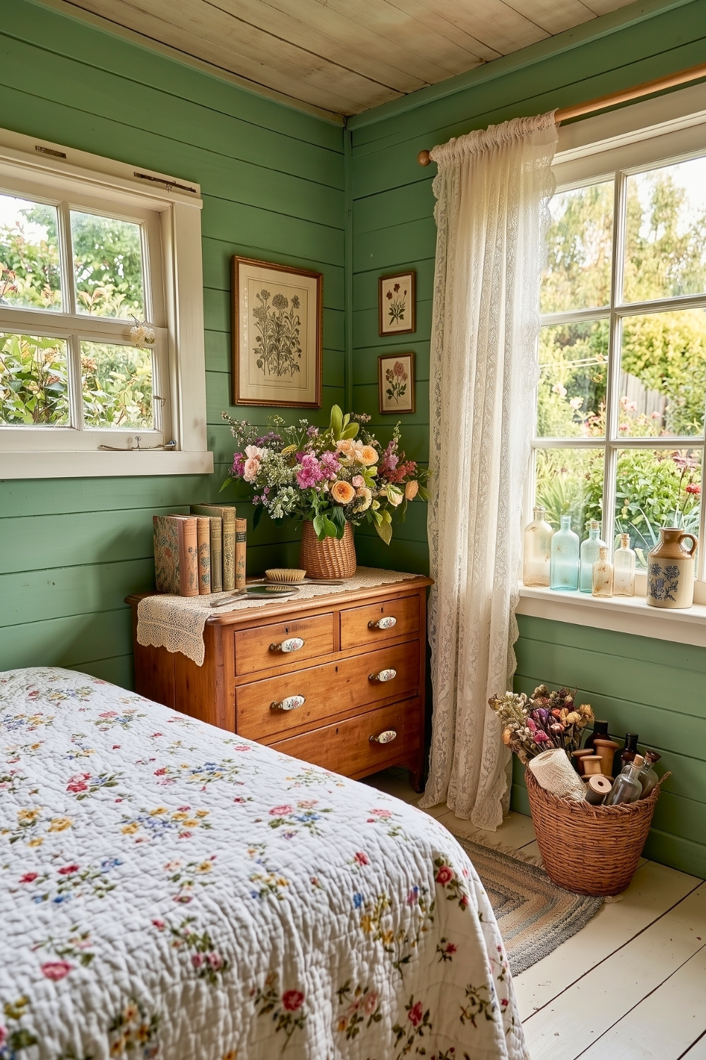 Muted green walls offer a refreshing change of pace from standard white or cream colors. I’ve found that a simple lace curtain lets in just enough soft light to highlight a colorful floral quilt. Tucking a wicker basket in the corner for storage keeps the room tidy while adding to the charming, cottage-core style.