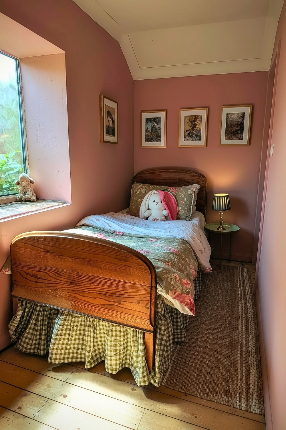 I honestly adore how u/ohhomelygirl used a lovely blossom pink paint to make a tiny corner feel like a true English cottage. My favorite part is definitely the mix of floral bedding and that green gingham skirt, which adds a really colorful farmhouse vibe. Using vintage-inspired furniture with earthy tones makes the 1809 design feel so welcoming. I think these cozy ideas would create a stunning French country aesthetic for any girl who loves to get lost in a book.