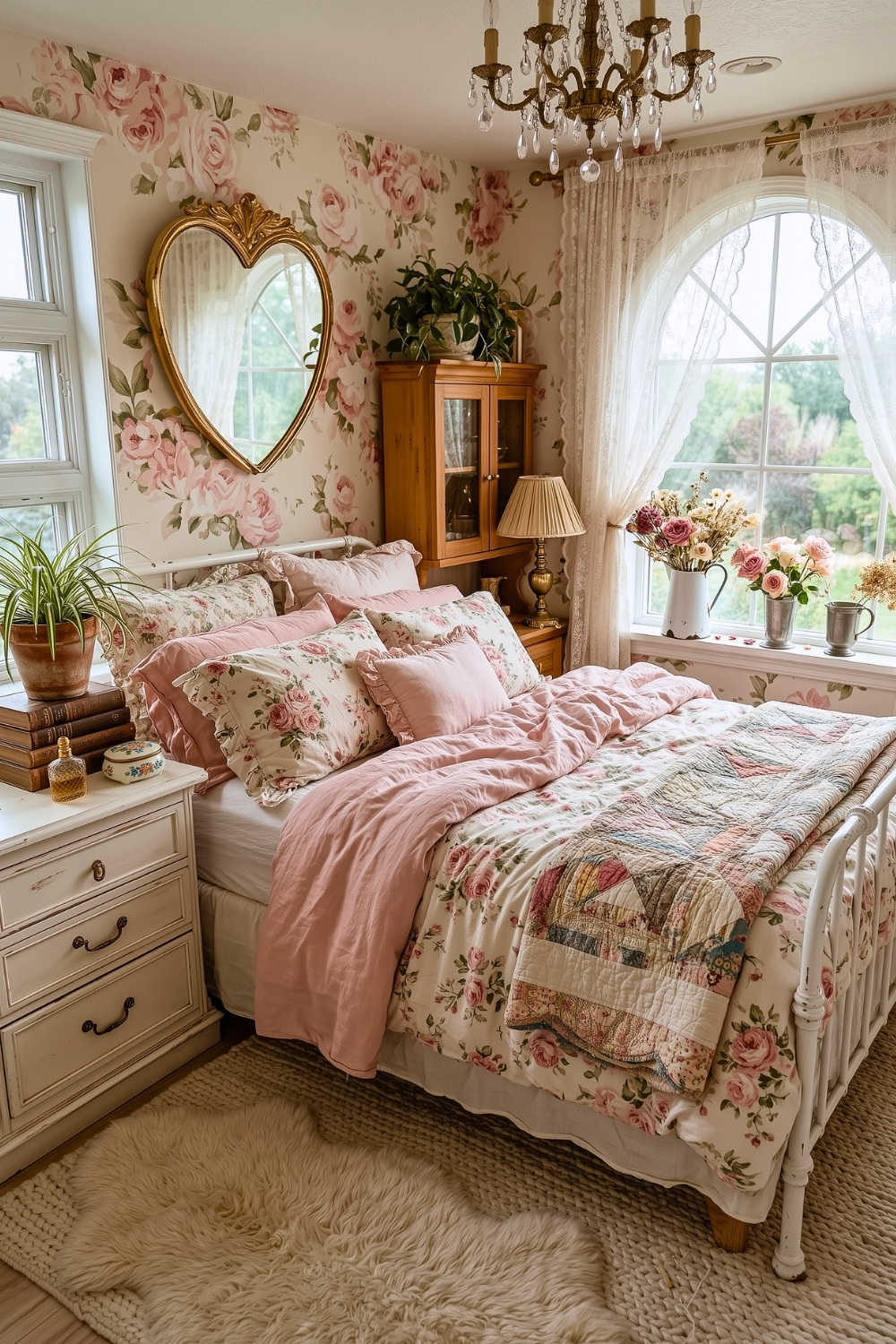 Romantic vibes really take over this space thanks to that bold pink rose wallpaper. I think the gold heart-shaped mirror adds a whimsical touch right above the headboard. These layers of floral bedding make the whole room feel like a soft, cozy retreat for any girl who loves a feminine style.