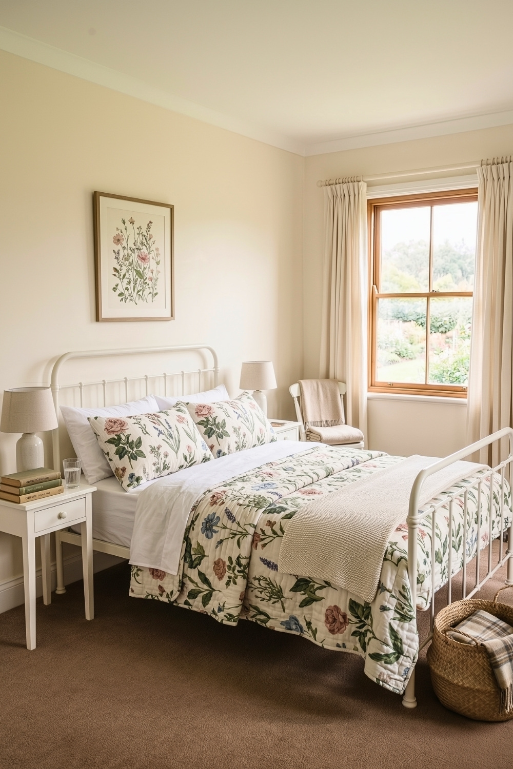 The white metal bed frame adds such a light and airy feel to this room without looking too modern. I think choosing botanical bedding with rose patterns is a wonderful way to bring a garden feel inside while keeping your walls simple. You can easily get this look by pairing a brown carpet with neutral furniture to let those floral accents stand out.