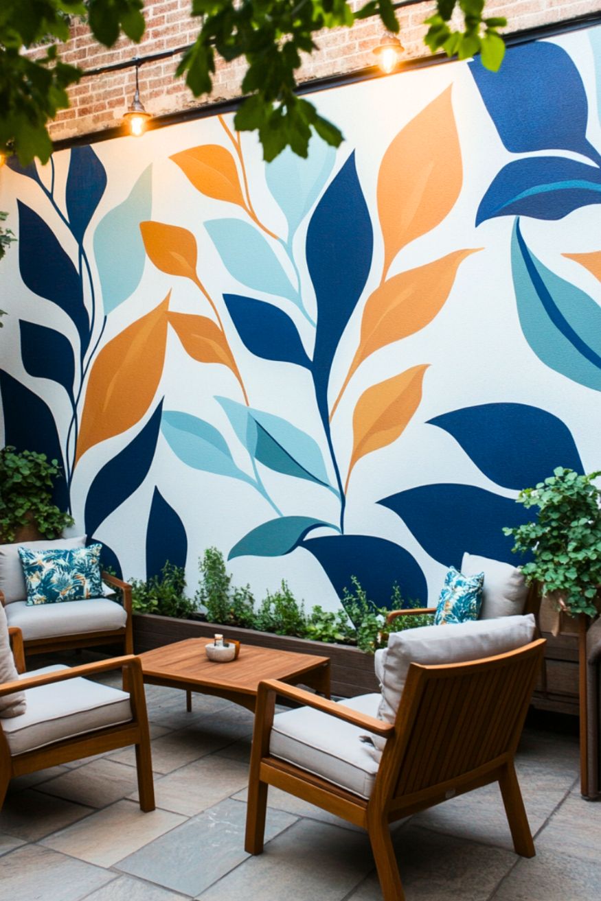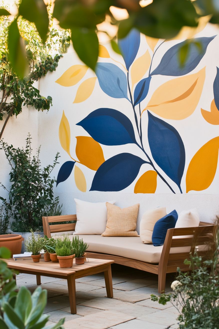 What I like about this wall is how bold it feels without making the space busy. The oversized leaves in deep blue and warm mustard instantly turn a plain wall into the focal point of the whole patio. Paired with the simple wooden seating and a few small potted plants, the mural makes the corner feel cozy and intentional instead of just decorative.