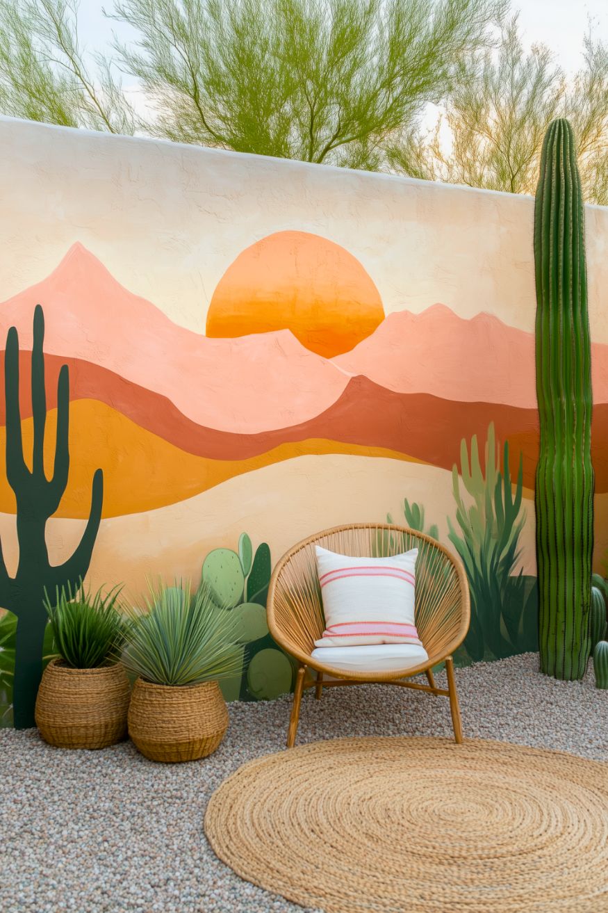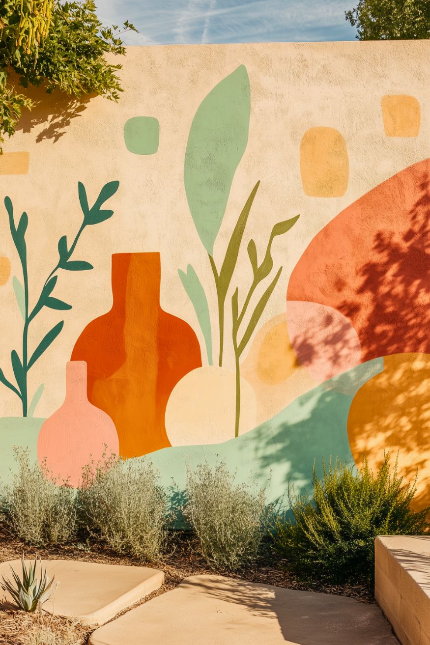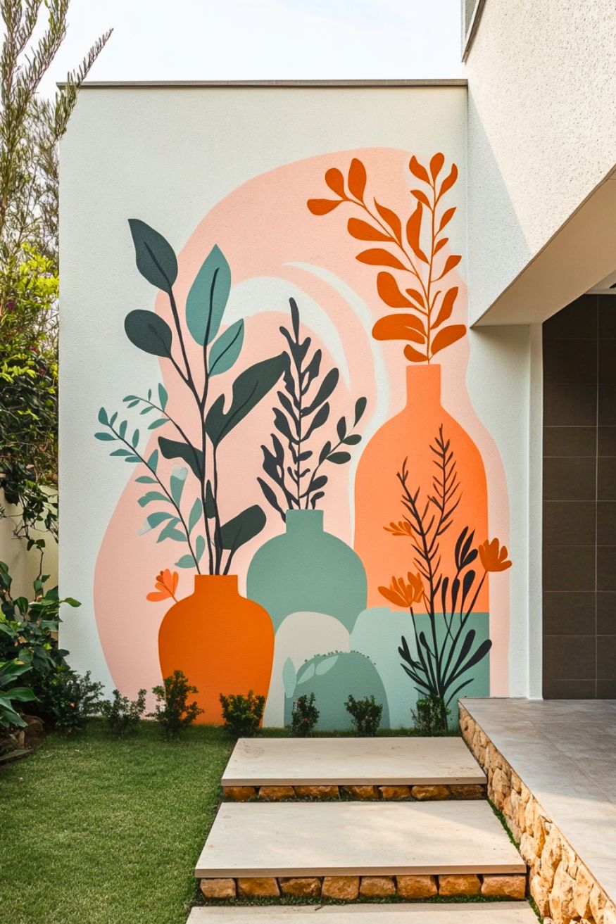 Using earthy orange, peach, and sage tones, this sleek mural features minimalist vases and plants for a modern aesthetic. It blends perfectly with concrete or white backyard walls, creating a chic and calming atmosphere. I find this design easy to replicate for anyone looking for a DIY project that adds both style and tranquility to their garden art while staying on trend with simple designs.