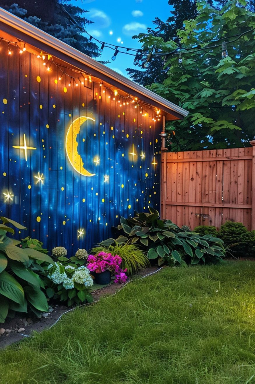 Let’s get started with night sky themes that can add a serene and mystical aura to your backyard. You can paint stars, constellations, and the moon in various phases. I often use glow-in-the-dark paint for the stars, which makes the mural come alive at night. Here’s a wonderful idea for stargazers who seek comfort in the peaceful embrace of the night sky.