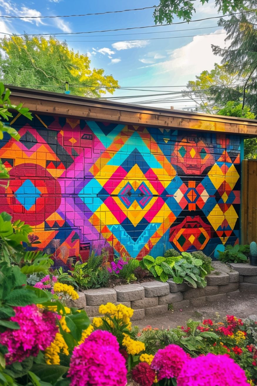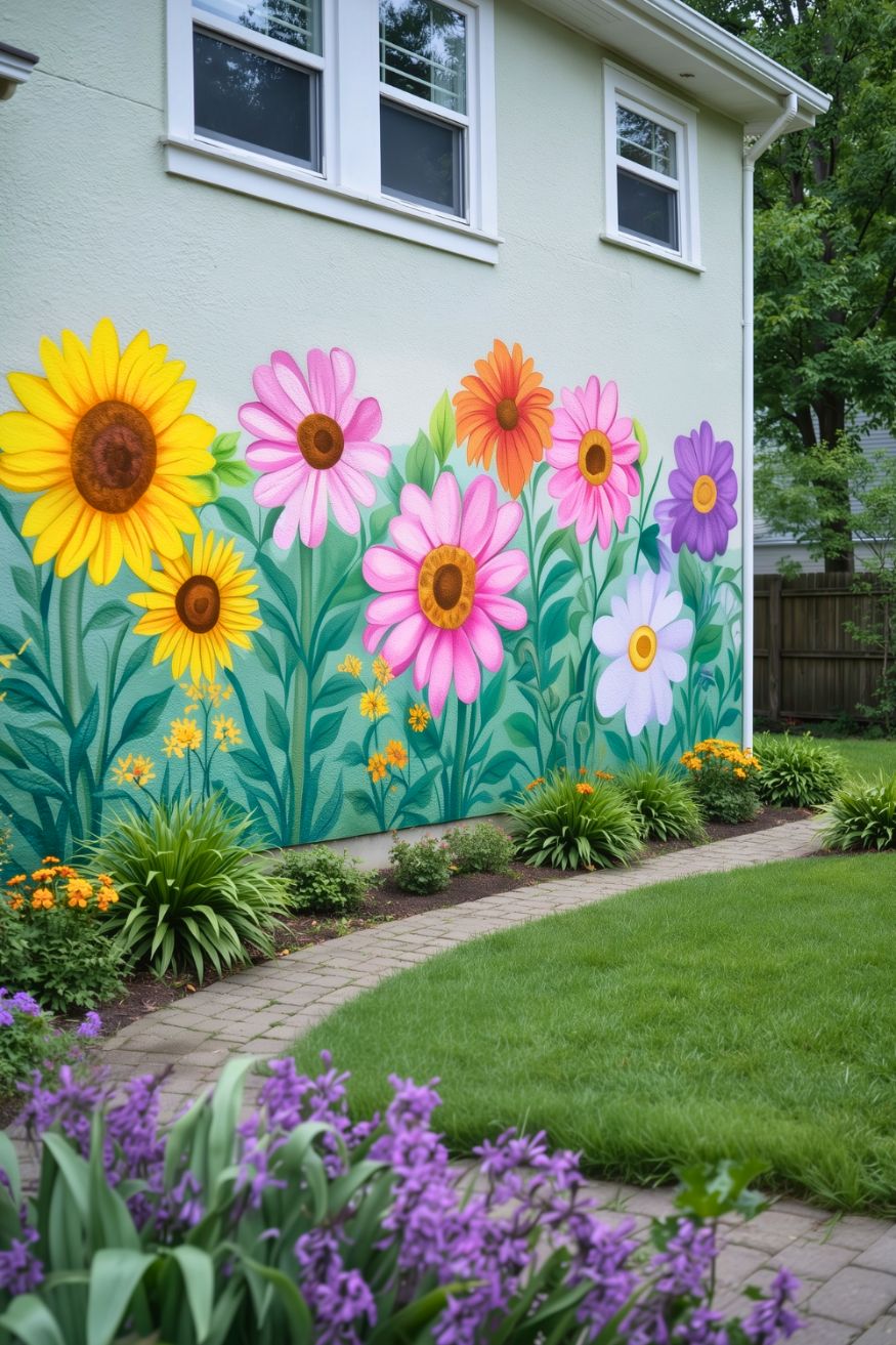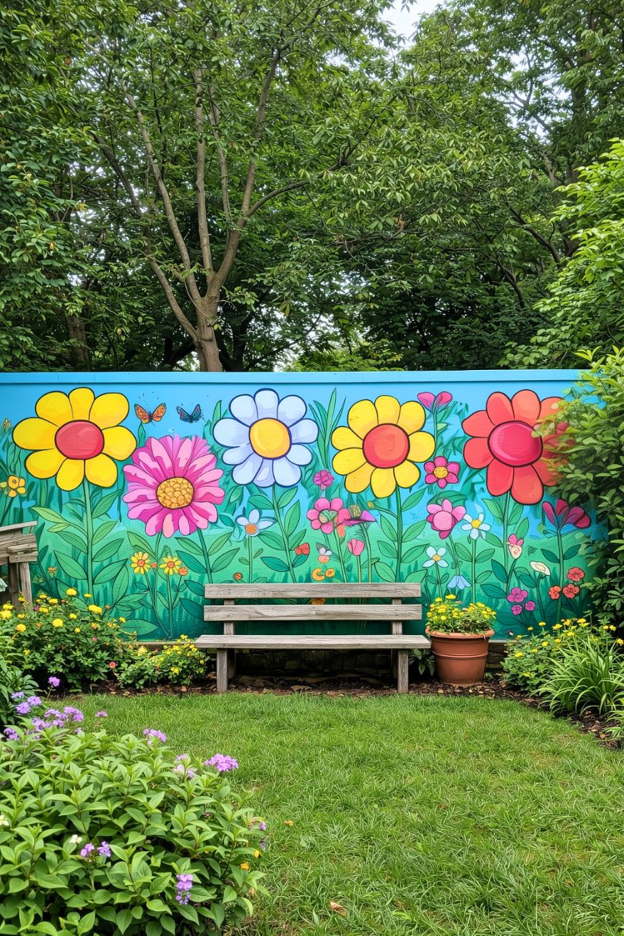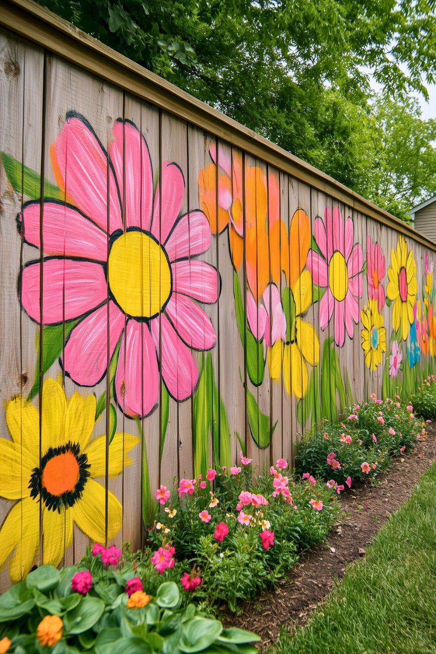 Nothing wakes up a plain backyard fence faster than oversized painted flowers like these. The bright pinks, yellows, and oranges instantly make the space feel playful and full of energy, almost like the garden keeps blooming even on the wall. I especially like how the mural sits right behind the real flower bed, so the painted stems and the living plants blend naturally.