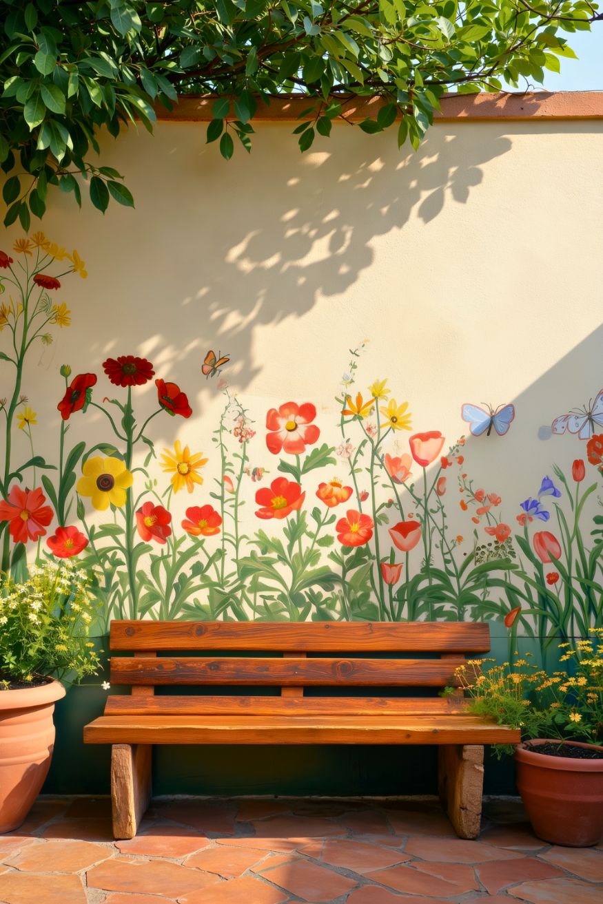 These oversized cartoon-style flowers turn the wall into a colorful garden of their own, almost like a playful mural you’d find in a park. With the bench sitting right in front, it instantly becomes a cheerful little spot to relax. When you add real flowers along the base of the wall, the mural and the garden start to blend beautifully.