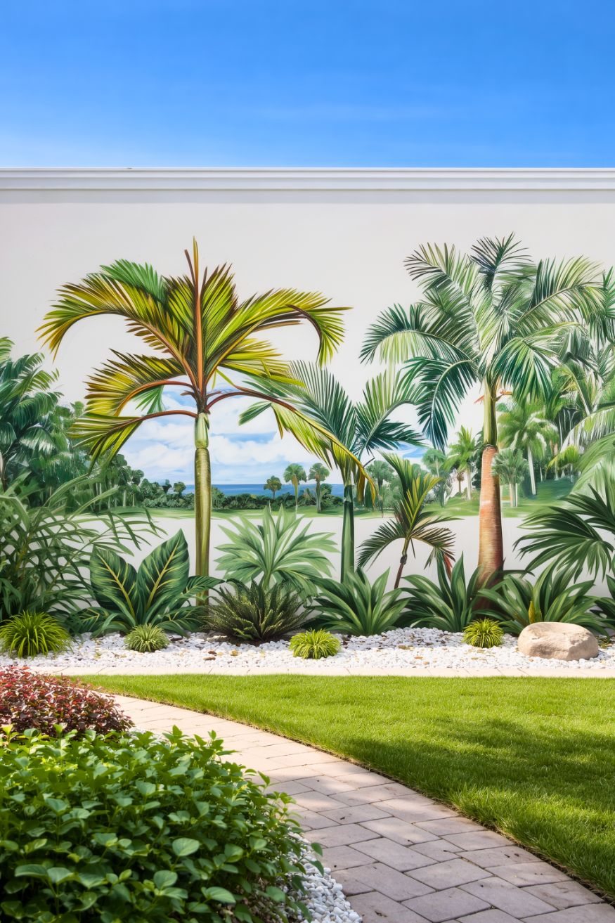 For a moment, this wall almost tricks your eyes into thinking the backyard opens up to a tropical landscape. The painted palms and distant greenery create the feeling of depth, like there’s a whole garden stretching beyond the wall. Paired with the real plants and clean landscaping in front, the mural blends surprisingly well with the space.
