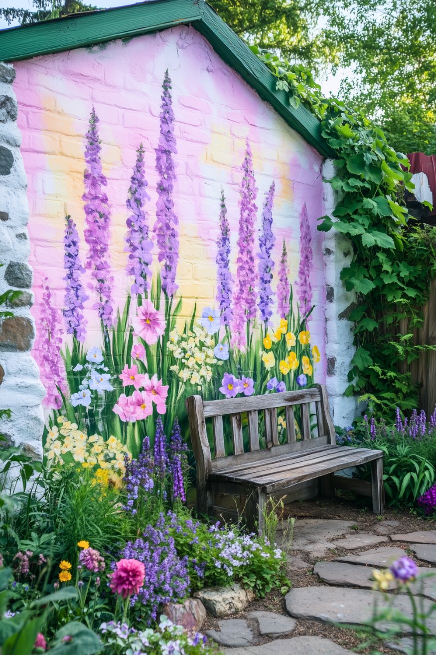 What I’m amazed about this idea is how naturally it fits into a small backyard nook. Tall, vertical flowers like lupines or delphiniums are fairly easy to paint, and when you plant similar colors nearby, the mural and the garden start to feel like one continuous scene. This little garden corner feels like something out of a storybook.