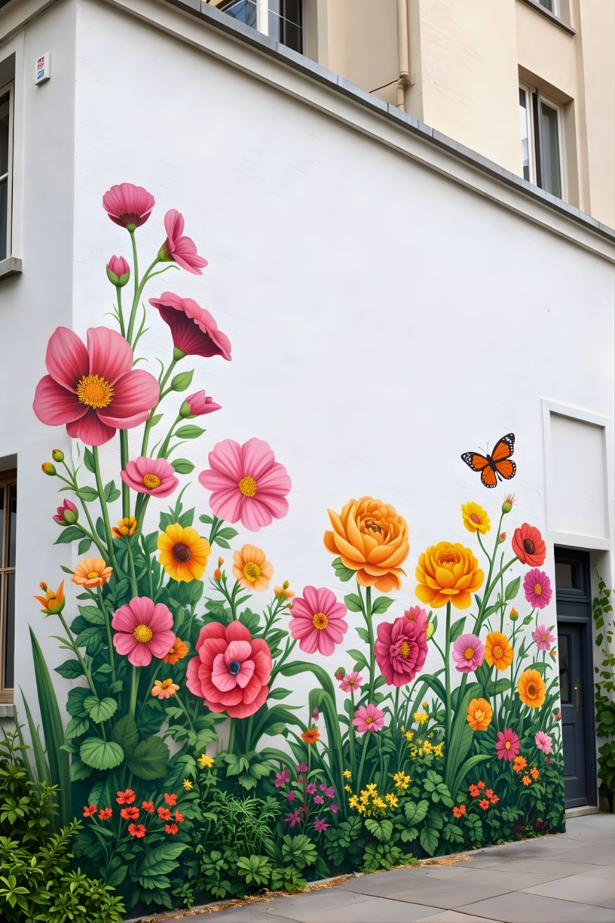 Sometimes, all a blank wall needs is a little garden painted onto it. These tall flowers stretch upward beside the window and doorway, making the building feel softer and more welcoming. I like how the mural stays mostly along the lower half of the wall, so the space still feels clean while the flowers add color and life. This is a nice approach if you want something decorative but not overwhelming.