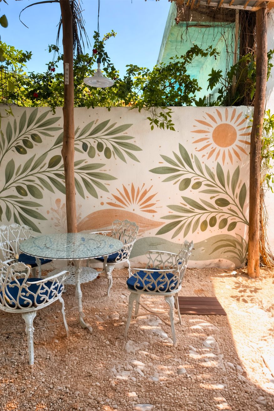 There’s something about these soft, earthy tones that instantly makes the space feel calmer. Instead of bold colors, the mural uses gentle olive branches and sun shapes that blend beautifully with the natural surroundings. It almost feels like the wall is part of the garden, not just behind it.