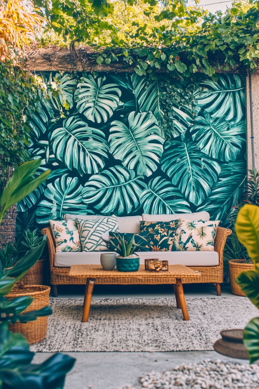 Some murals don’t just decorate a wall; they completely change the mood of the space. The deep green background and oversized tropical leaves here make this little seating area feel like a hidden garden retreat. Even with simple wicker furniture, the whole spot suddenly looks lush and layered. What makes this idea work so well is sticking to one theme. A few large monstera-style leaves painted in different shades of green can instantly create that tropical vibe.