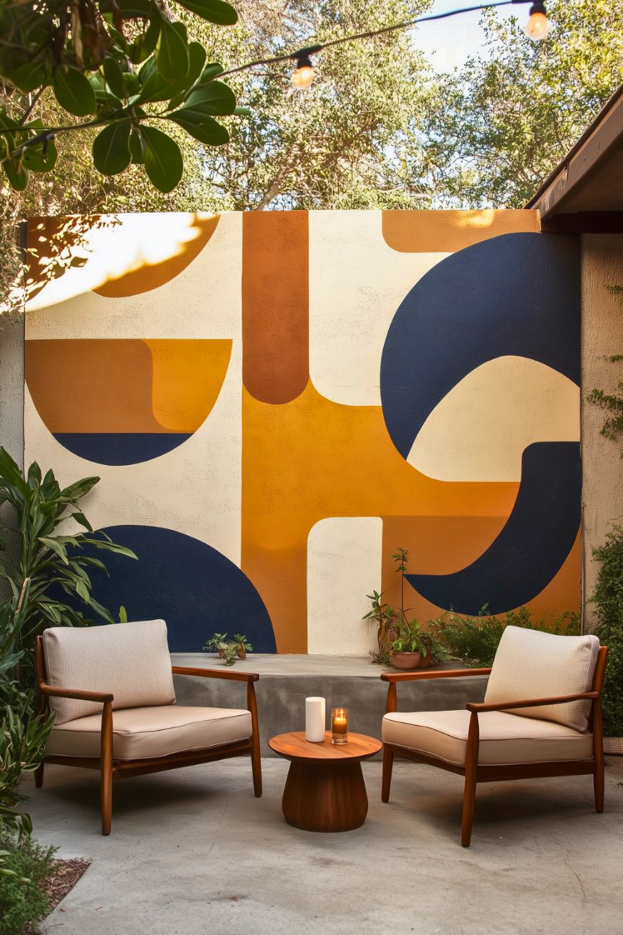The bold geometric shapes and warm sunset tones turn a simple patio corner into something that feels thoughtfully designed. Paired with mid-century style chairs and soft lighting overhead, the mural becomes the focal point without overwhelming the space. This idea works with the balance of colors and shapes. Clean lines and a limited palette can instantly give your backyard wall a modern, designer feel.