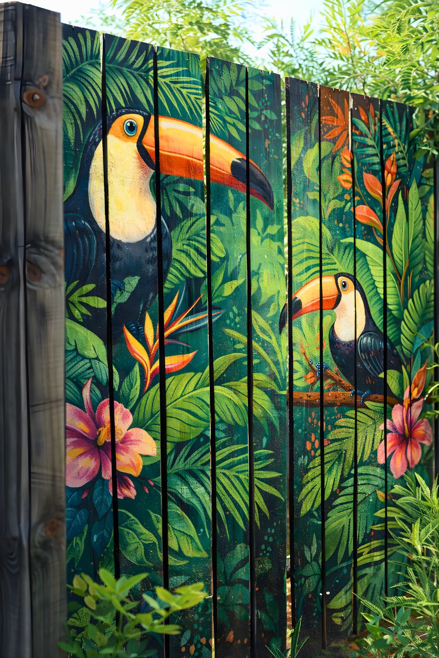 At first glance, I don’t expect a fence to feel this alive, but those painted parrots instantly change the whole mood. The rich greens and bold, tropical colors pull you in, almost like a little slice of jungle tucked into your backyard. It works because the mural isn’t just decoration; it becomes the focal point that makes everything around it feel more vibrant.