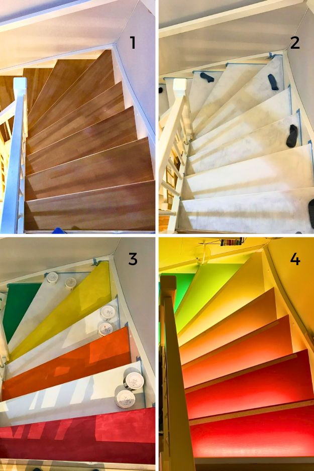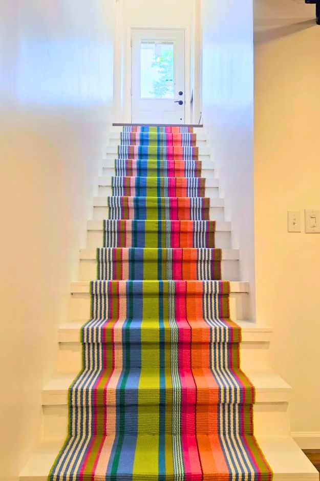 rarely_neutral’s rainbow staircase is the kind of project that makes me want to rip up carpet immediately. They pulled off the old carpeting, painted the wood in bright rainbow shades, then topped the treads with carpet tiles, smart, since it adds grip and durability while keeping the color.