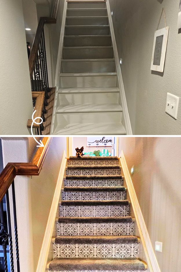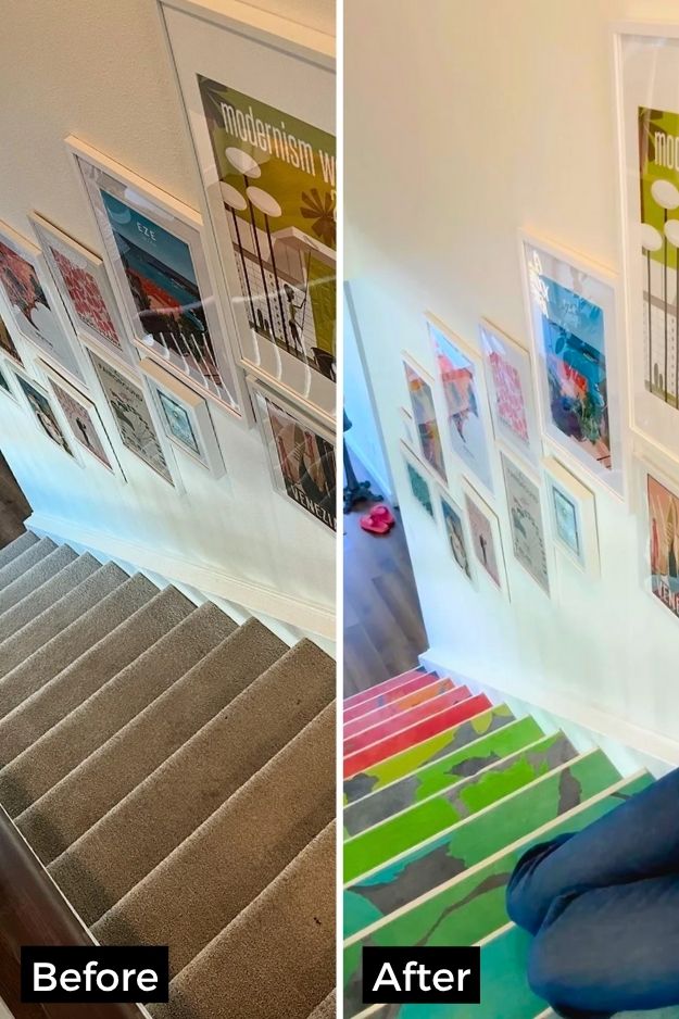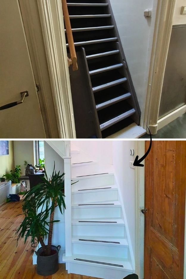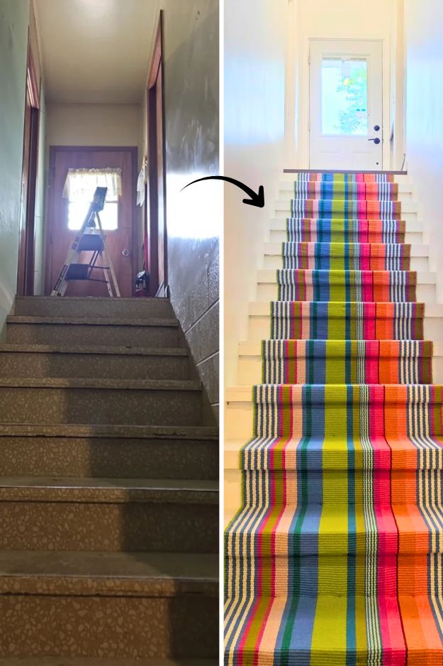 The before-and-after of u/Greedy_Activity8513’s basement stairs is wild, it went from dungeon vibes to the happiest little runway.
