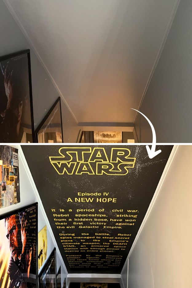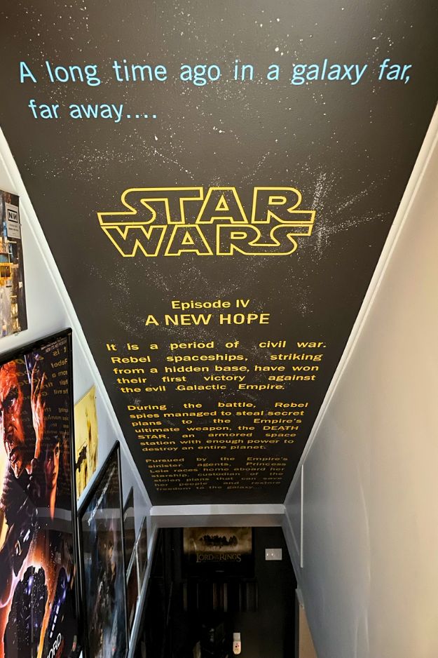 u/fincheresque turned the basement stairs into Star Wars stairs, and I can’t get over how cool it looks. The whole thing was done with Cricut vinyl in maize yellow and turquoise blue, measured out, cut piece by piece, and stuck up with painter’s tape, seriously a test of patience.