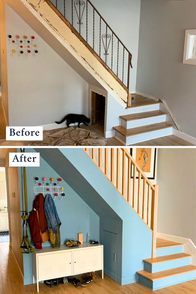 The powdery blue paint in u/jaggy333’s remodel softens the space without making it feel cold, and paired with the warm wood treads. It looks fresh and timeless. The little under-stair cubby makes smart use of what could’ve been wasted space, while details like the Eames Hang-It-All and a simple Ikea pendant add just the right dose of design personality.