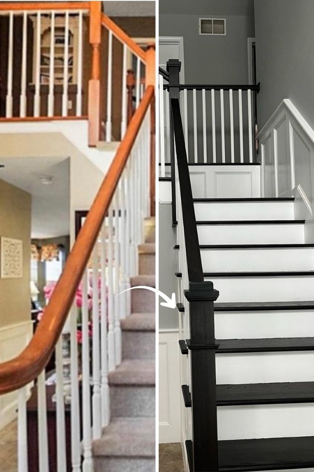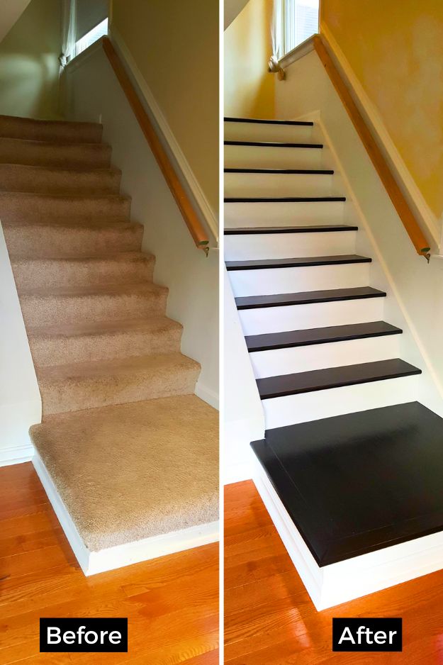 Converting carpeted stairs to hardwood always looks sharp, but I’m amazed how tricky it can be. The black-stained treads against white risers make a bold statement, and I liked the smart move of staining every other step so the stairs stayed usable while drying. But you need to be aware of the riser heights, and mind you, wood is louder and more slippery than carpet. See the details of the work here.