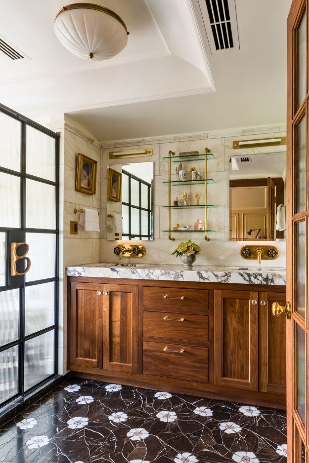 What really caught my eye here is the shelf choice. The glass-and-metal shelves feel intentionally light against all that heavy marble and wood. I like the contrast in theory, especially in a bathroom where bulky shelving can overwhelm fast, but these read more as styling moments than real storage. From ManiaforBeatles