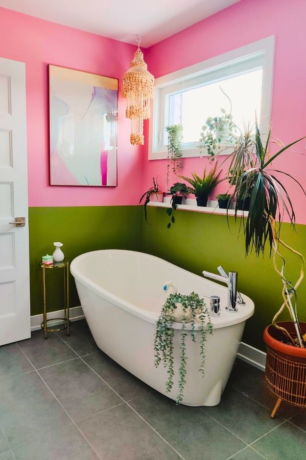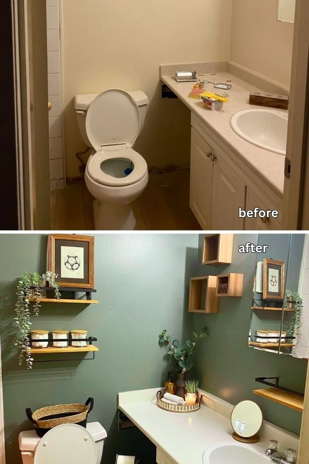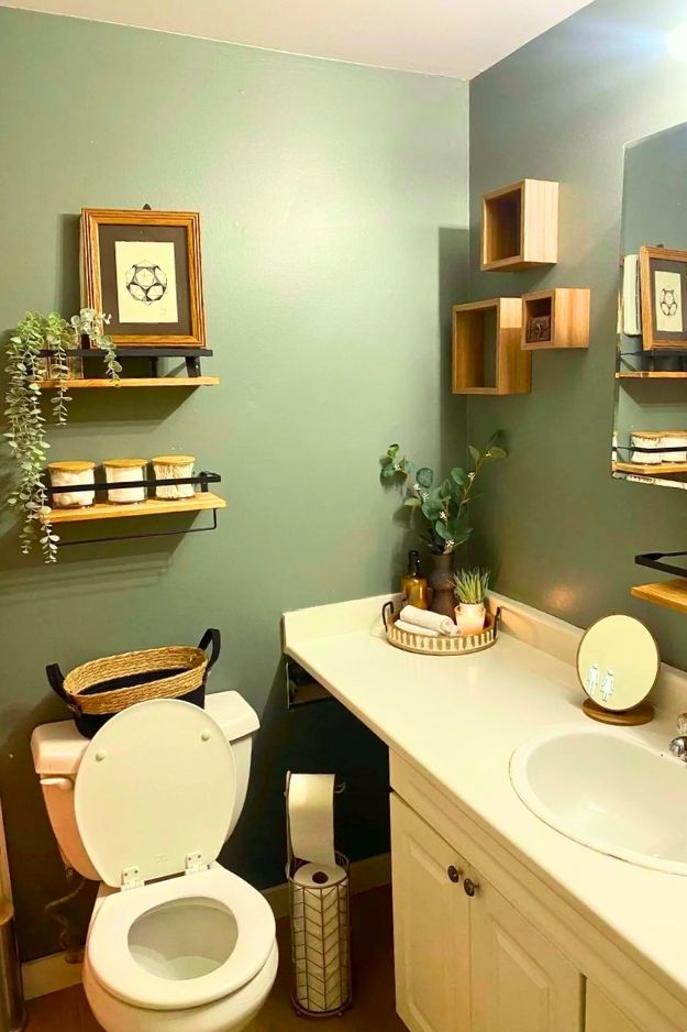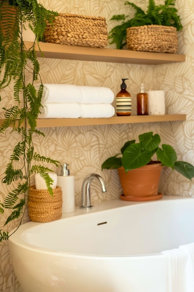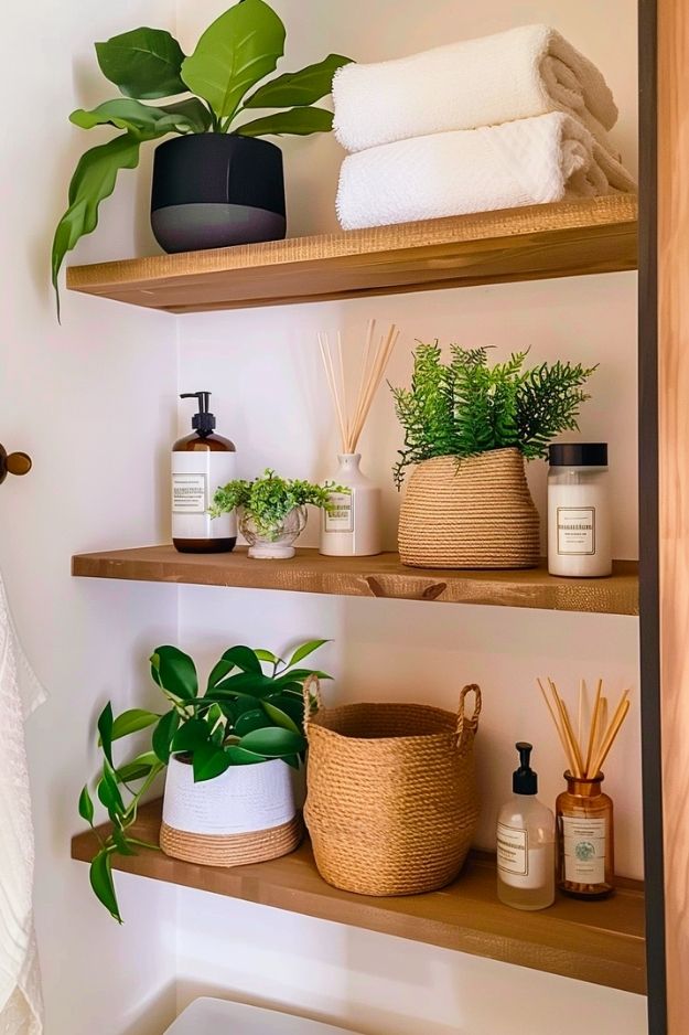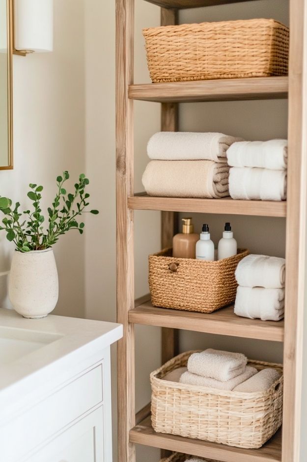 Open shelves like these just work in a bathroom. They keep things feeling light and airy, and the mix of wood, plants, and woven baskets makes the space feel warm instead of clinical. As long as you keep it styled and not overstuffed, it’s a really easy way to add storage without making the room feel crowded.