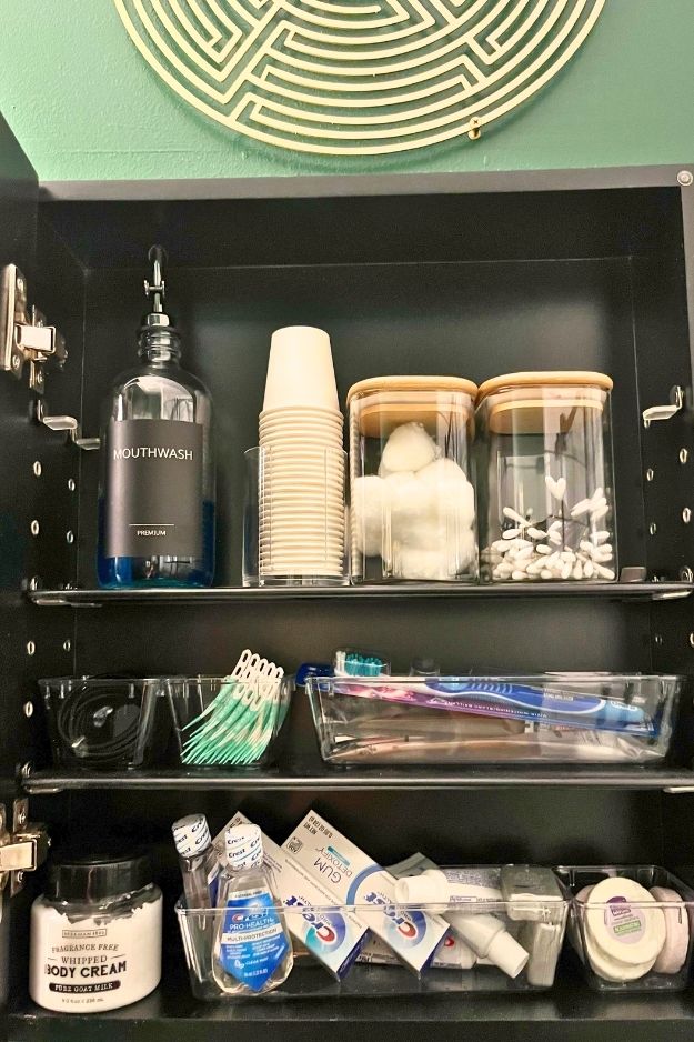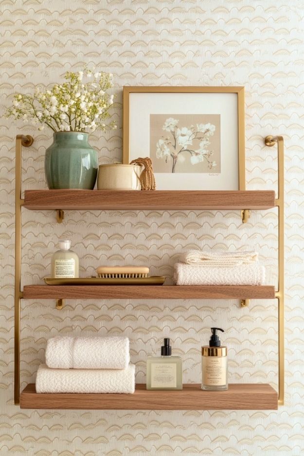 This wood-and-metal shelf feels clean and intentional without trying too hard. The warm wood softens the metal frame, and the open design keeps everything looking styled instead of crowded. It’s the kind of shelf that makes everyday bathroom items feel a little more put together.