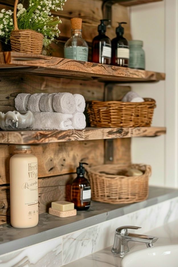 I actually like how these shelves are done. The chunky wood gives them a solid, grounded feel, and the baskets help keep things from looking messy. Open shelves can go downhill fast, but this setup feels calm and intentional. It’s practical without screaming “storage,” which is honestly the sweet spot for bathroom shelving.