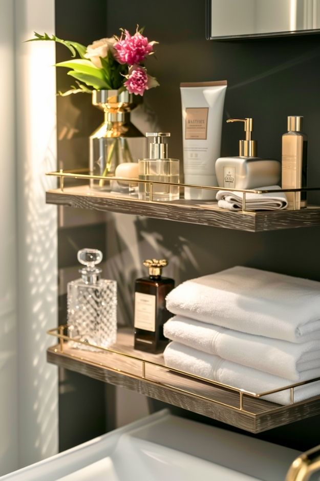 This shelf choice leans way more styled than purely practical, and honestly, it works. The dark wood paired with the slim brass rail instantly makes it feel intentional, almost like a mini hotel moment. I like that the rail adds a bit of security without looking bulky, so things don’t feel one accidental bump away from disaster. It’s still an open shelf, but this setup feels controlled and polished rather than clutter-prone.