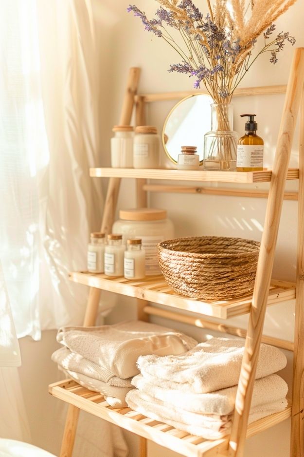A little ladder shelf like this feels relaxed and effortless, almost like it was added over time. The light wood, soft linens, and glass jars keep everything looking calm and uncluttered, while still being super practical. It’s a great option if you want open storage without committing to drilling shelves into the wall.