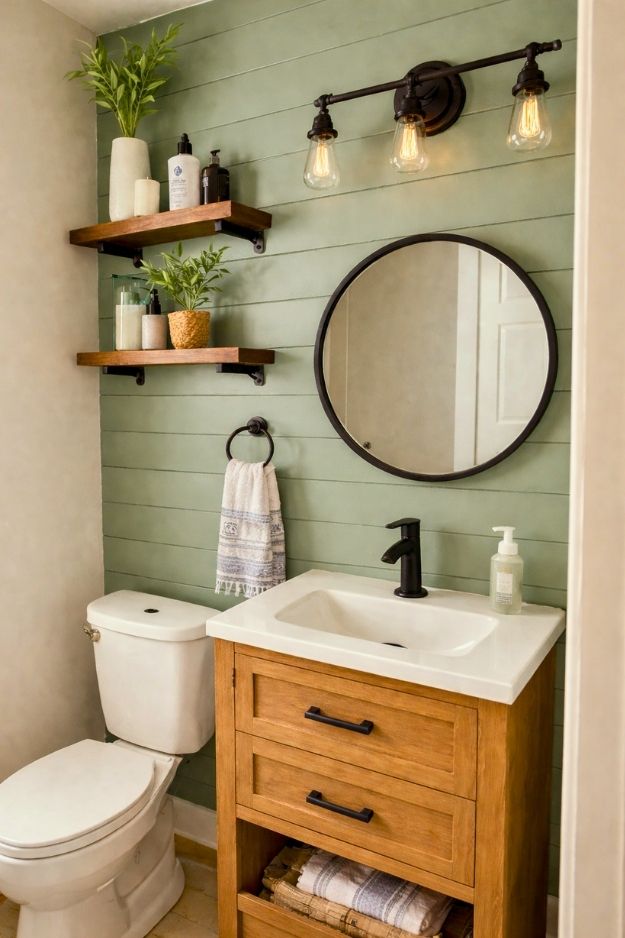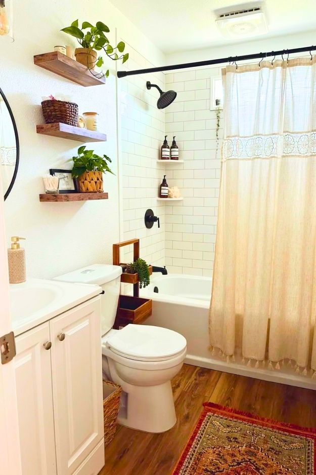 This bathroom just feels easy to live with. The floating shelves above the toilet are nothing fancy, but the warm wood paired with those simple black metal brackets totally works. They’re practical enough to hold everyday stuff, yet still styled lightly so the space doesn’t feel crowded.