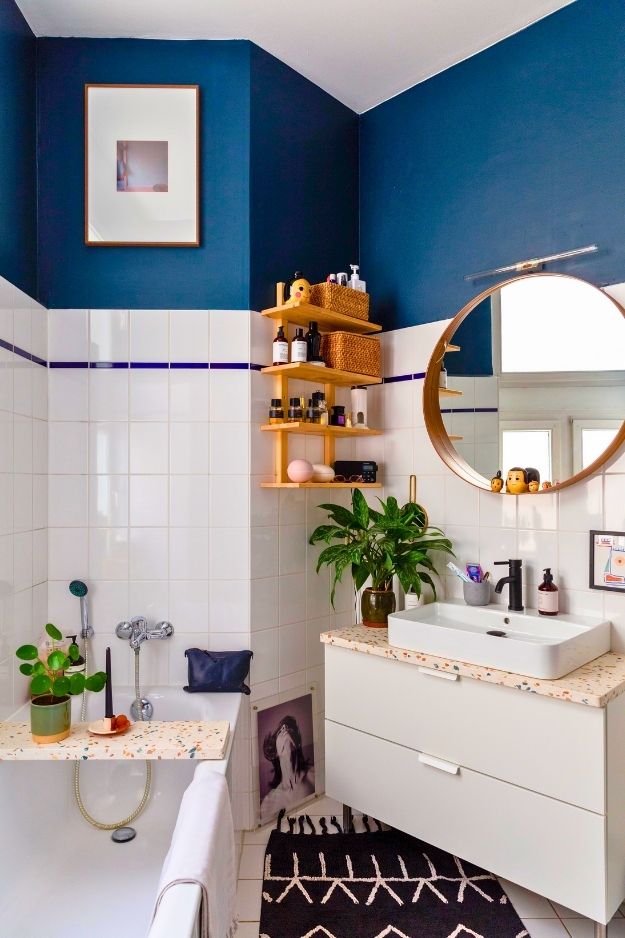 What I really like here is how restrained the shelving feels. There’s just one slim wall shelf, but it’s placed so intentionally that it adds function without cluttering an already bold space. With the deep blue walls and that terrazzo moment doing most of the talking, the shelf stays quiet and practical, holding just a few essentials instead of competing for attention. By synem_
