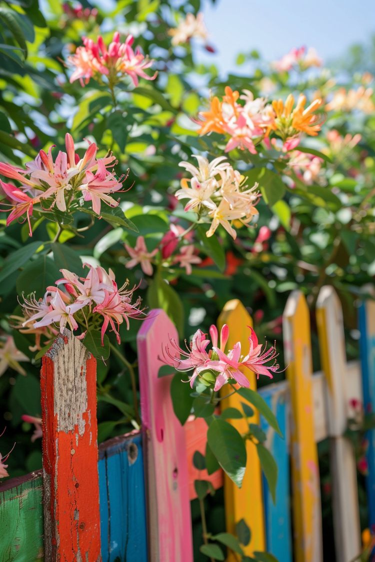 I like how this fence doesn’t try to be subtle at all. The bright painted slats already feel cheerful, but the climbing flowers spilling over the top make it even better. It almost looks like the garden is slowly taking over the fence in the prettiest way possible. The weathered paint gives it that relaxed, boho personality, too. Nothing feels too polished. Honestly, this is one of those ideas where a little leftover paint and a flowering vine could completely transform an ordinary fence into something that feels lively and full of character.