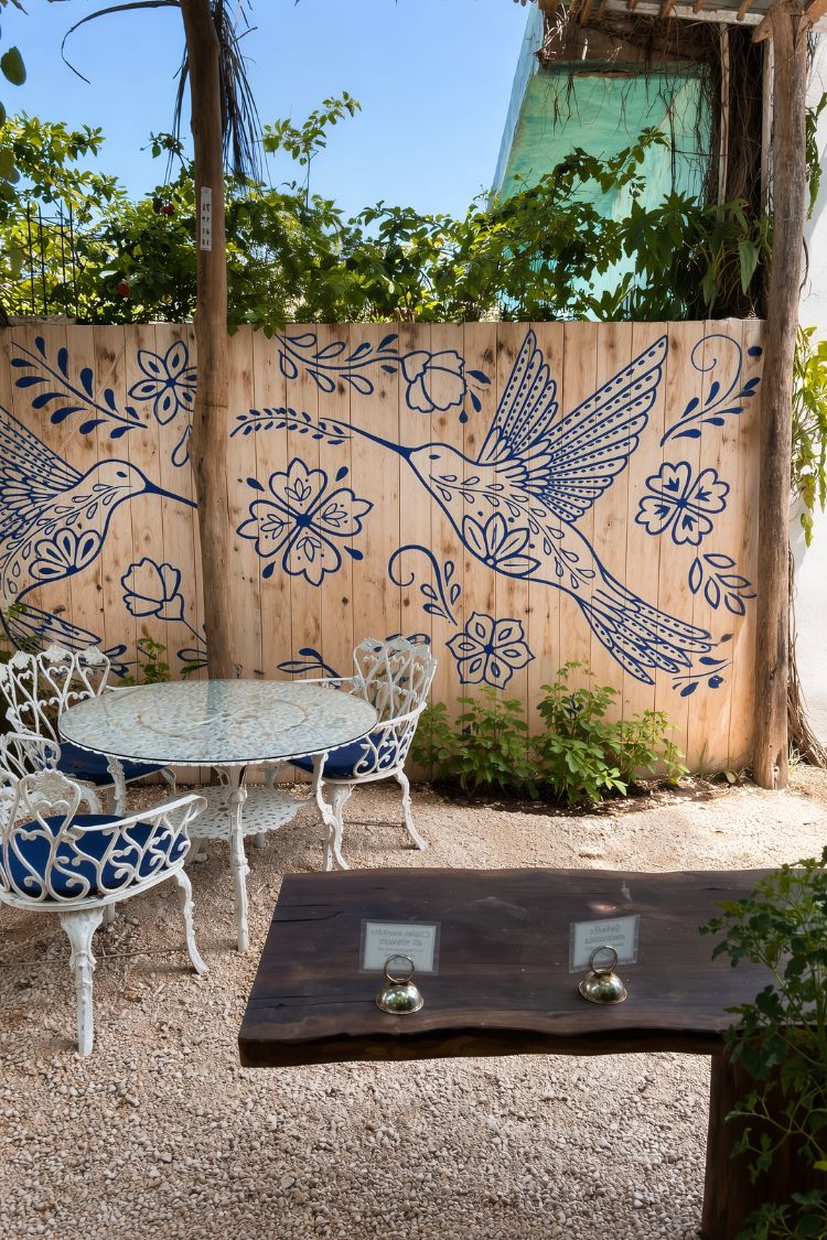 This is the kind of fence that quietly steals the whole space, like you think it’s just a backdrop until you realize everything else is arranged around it. The blue linework feels effortless but still detailed enough to keep your eyes moving, and I can already tell I’d pick this spot every time just to sit near it.