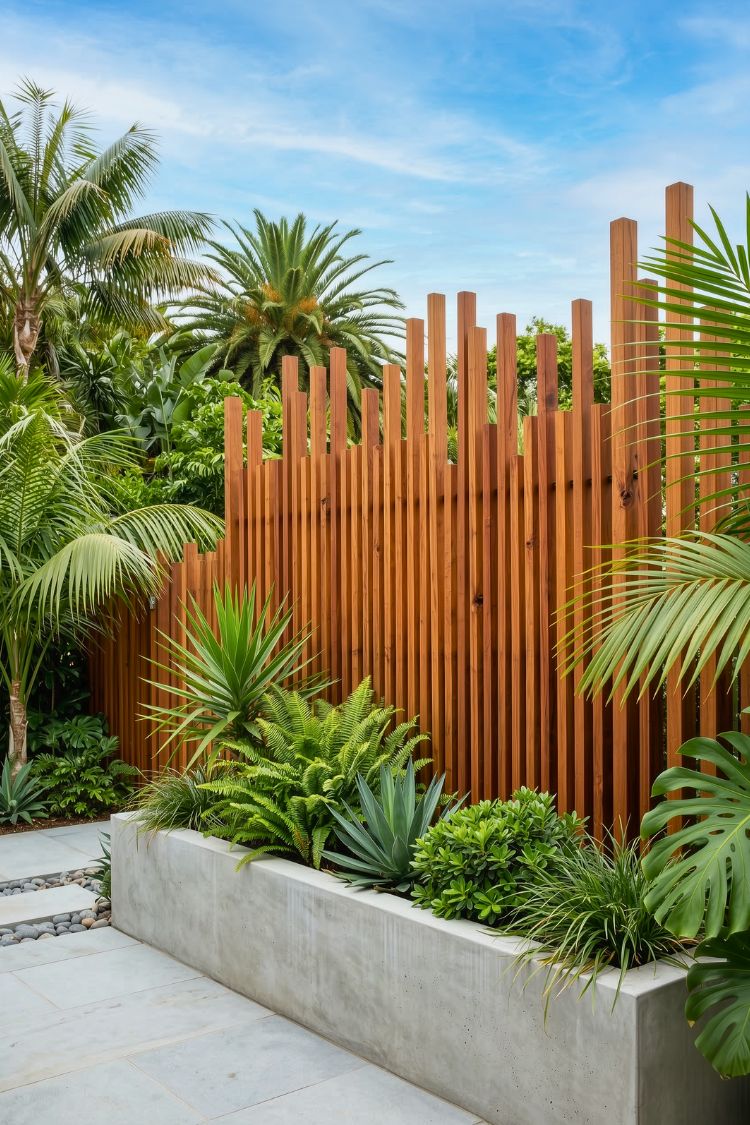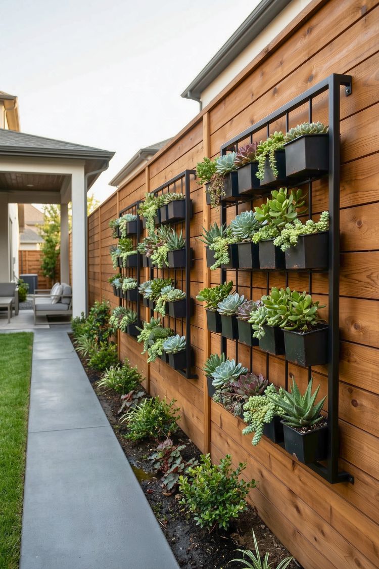 A plain fence wall can easily feel like wasted space, but this setup turns it into a vertical garden. The metal frames with rows of succulent planters add texture and greenery without taking up any ground space. It feels like a smart solution for narrow side yards, too. Instead of leaving the fence bare, it becomes a living wall that quietly brings the whole walkway to life.
