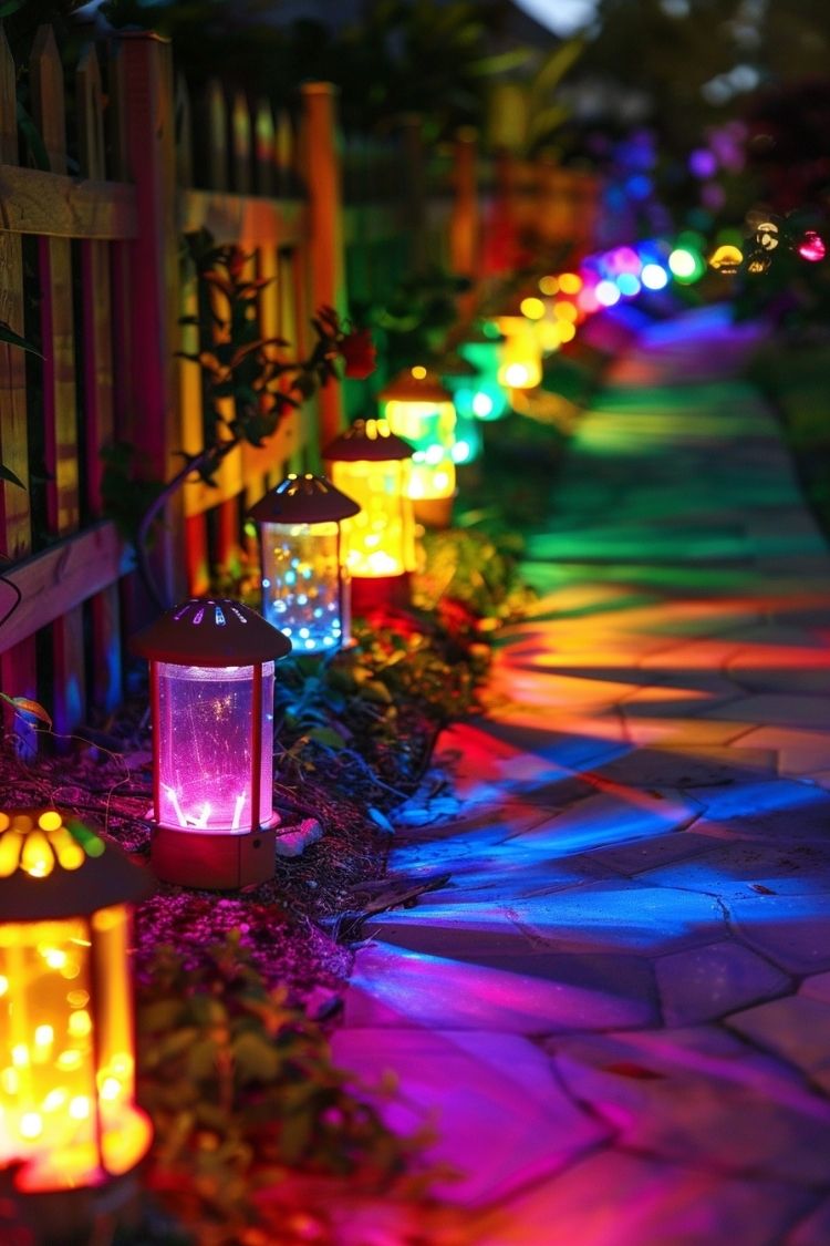 I wasn’t expecting a fence to look this magical at night, but the lighting here completely changes the mood of the garden. The row of colorful lanterns along the fence makes the whole pathway glow like a little rainbow trail. I like how the lights spill onto the stone path and plants, turning a simple walkway into something you’d actually want to stroll through after dark.