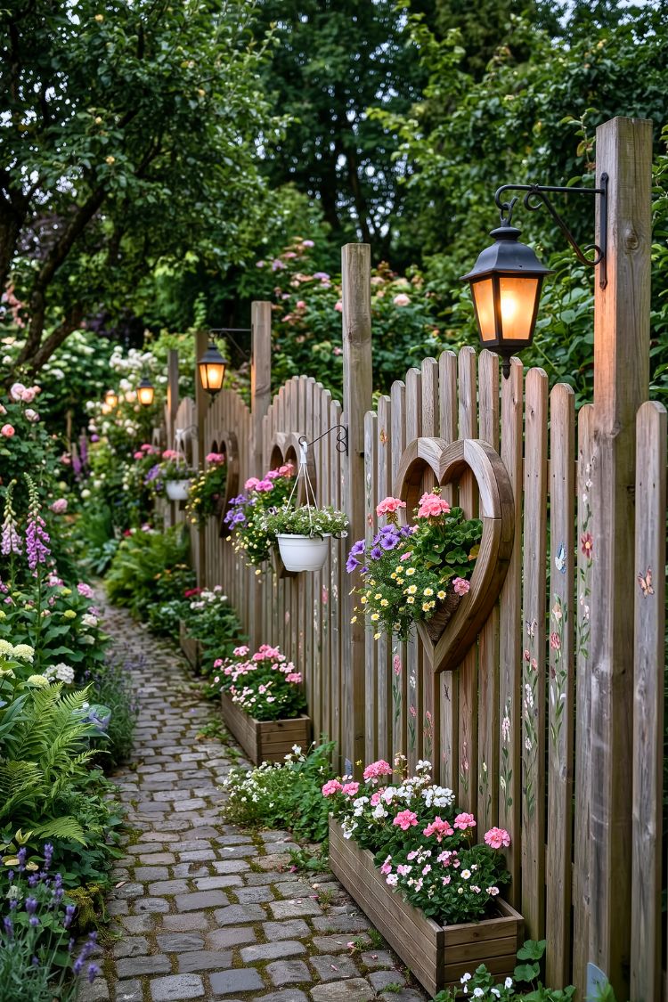 Something about this fence makes the whole garden path feel more intimate. The heart-shaped planter is a charming detail that immediately catches the eye. With the cobblestone path and flowers lining the base, the whole scene feels cozy and welcoming, like a quiet corner of a cottage garden you’d want to wander through slowly.