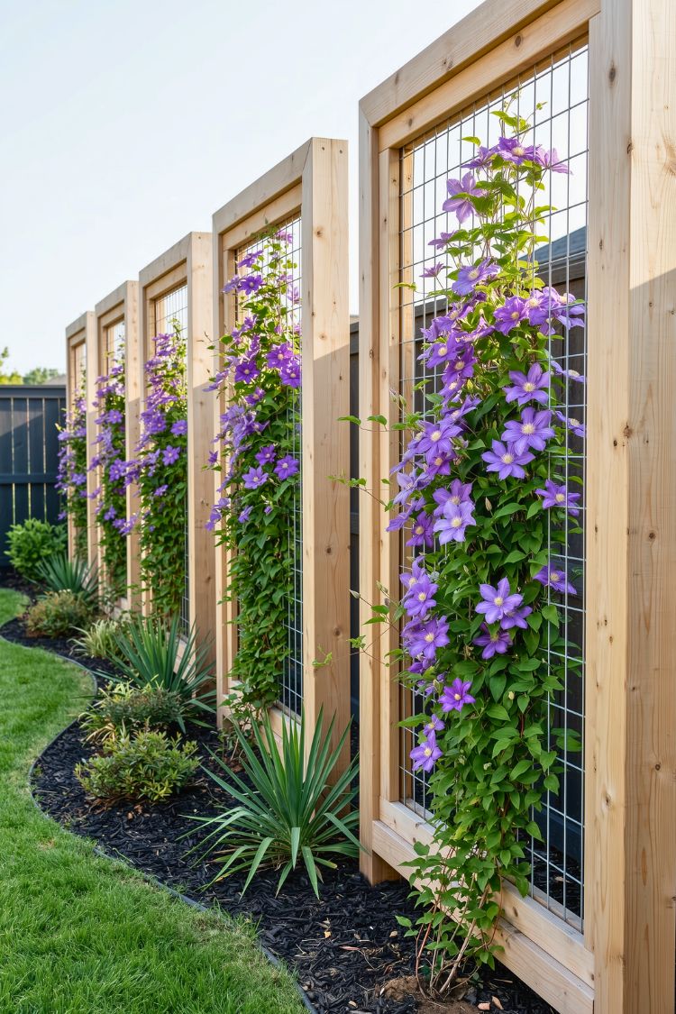 I like how this fence design feels open and structured at the same time. The wooden frames create a clean, modern rhythm along the yard, while the wire panels give climbing plants a perfect place to grow. As the clematis vines climb higher, the fence slowly turns into a living wall of purple blooms. It’s a nice balance between architecture and nature.