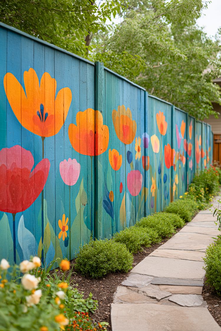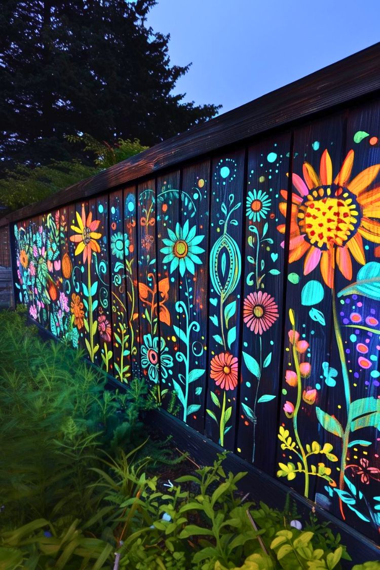 A plain fence can feel like a blank wall, but this one turns into a full piece of garden art. The dark wood makes the bright flowers pop, and the colorful mural stretches across the panels like a glowing wildflower field. It almost feels magical at dusk, when the colors stand out even more against the deep background.