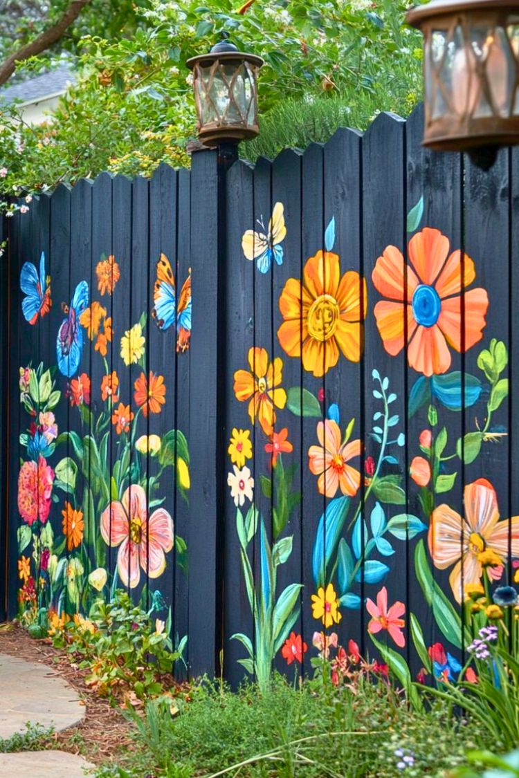 A dark fence like this works almost like a canvas. The deep black boards make every painted flower and butterfly pop, turning the whole wall into a cheerful garden mural. It even feels like the artwork is blooming right alongside the real plants at the base. If I were recreating a setup like this, I’d probably plant lilies along the bottom edge. Their tall stems and bold blooms would echo the painted flowers above and make the whole fence feel even more alive.