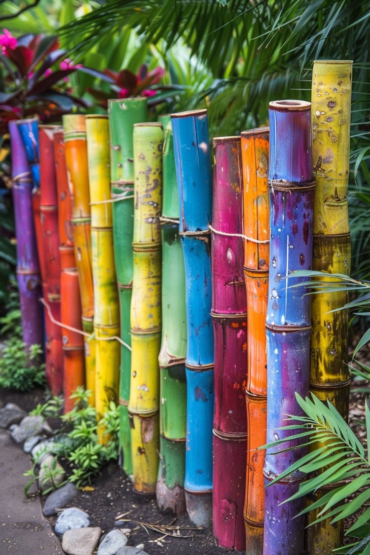 The first thing that caught my eye here is the bamboo itself. Using thick bamboo poles as a fence already gives the garden a tropical, relaxed feel, but the bold paint takes it somewhere more playful. Every stalk is a different color, which makes the whole thing look almost like a rainbow wall tucked into the greenery.