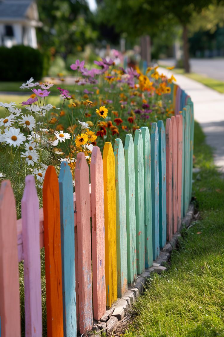Walking past something like this would probably make me slow down for a second. The soft pastel fence already feels cheerful, but paired with a strip of wildflowers behind it, the whole thing turns into a tiny burst of color along the sidewalk. It doesn’t look overly designed either, which is part of the charm.