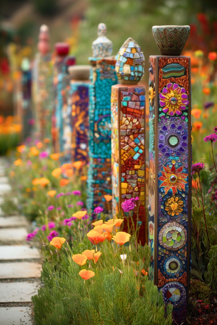 At first glance, these posts almost look like a row of outdoor sculptures rather than a fence. Each one is covered in colorful mosaic patterns, so the whole border feels like a mini art gallery running along the garden path. I can imagine this being a long-term project too, slowly adding tiles, glass pieces, or little ceramic details over time until the fence becomes something completely unique.