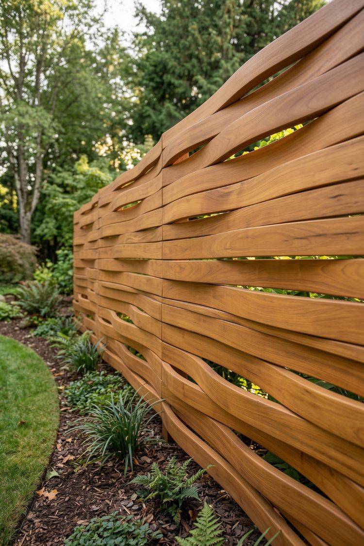 The shape of this fence immediately stands out. Instead of straight boards, the wood flows in soft waves, almost like the fence is moving through the garden. It feels more like a piece of landscape design than a typical barrier.