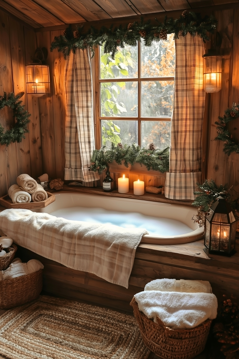 I am completely in love with how this space captures those festive Christmas vibes, using simple greenery and warm candles to frame a relaxing bubble bath. The plaid curtain and vintage-style lanterns make it feel like the ultimate winter hideaway where you can escape the mountain cold for hours on end. It’s the kind of decorating style that reminds me why I love the holidays – it’s all about creating a sanctuary that feels safe, warm, and personal.