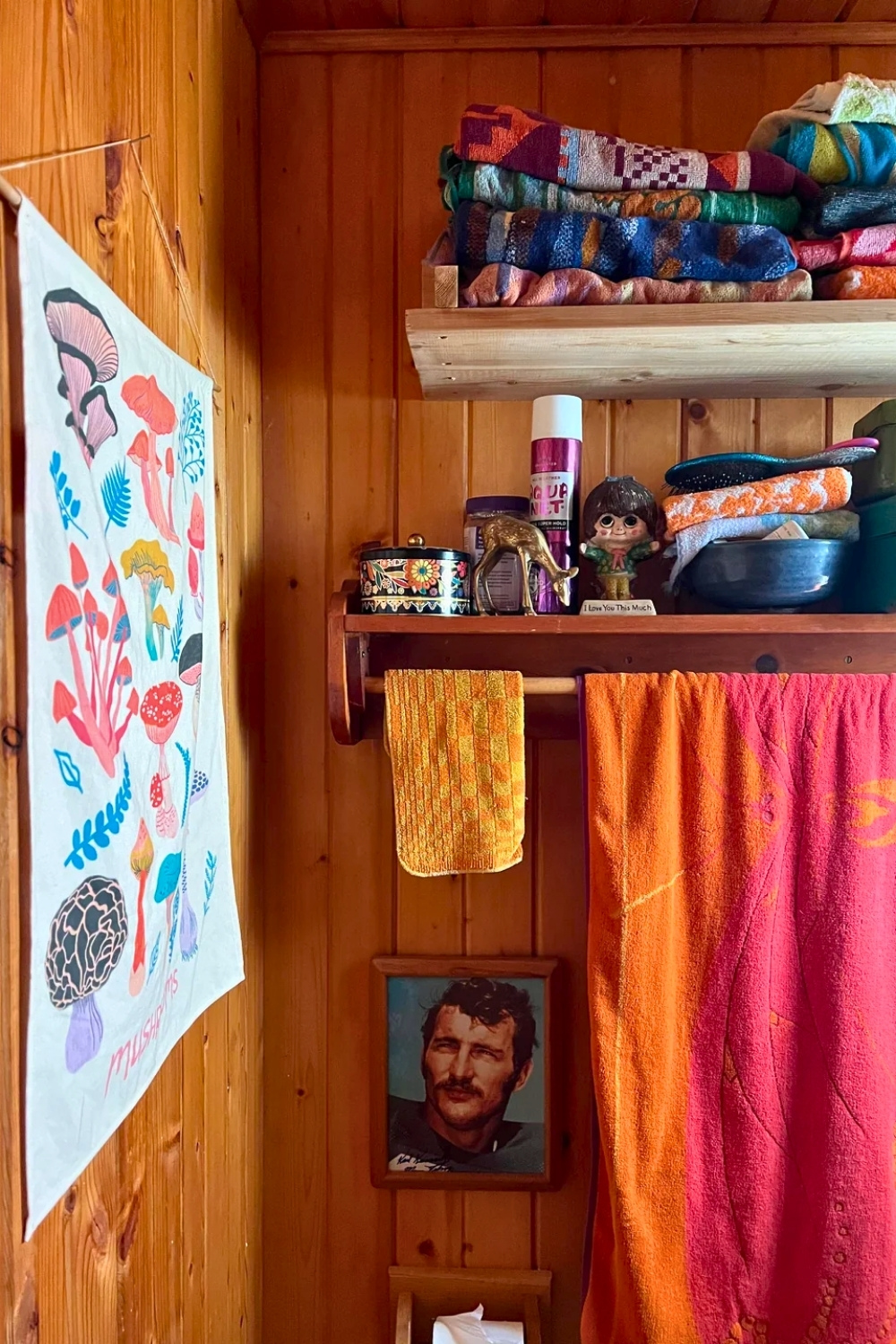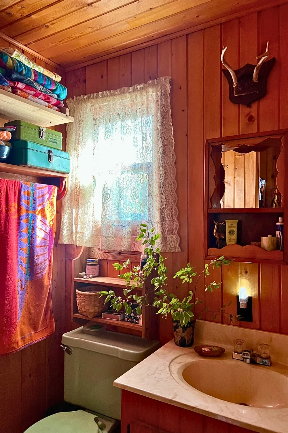 Back inside, this next space proves that cozy style isn’t about square footage – it is about the interior details and history. I find so much inspiration in the knotty pine walls and the vintage green fixtures near the vanity. u/damestillmen did an amazing job with this renovation, honoring the cabin’s 1950s roots while creating a space that feels inviting and soulful.