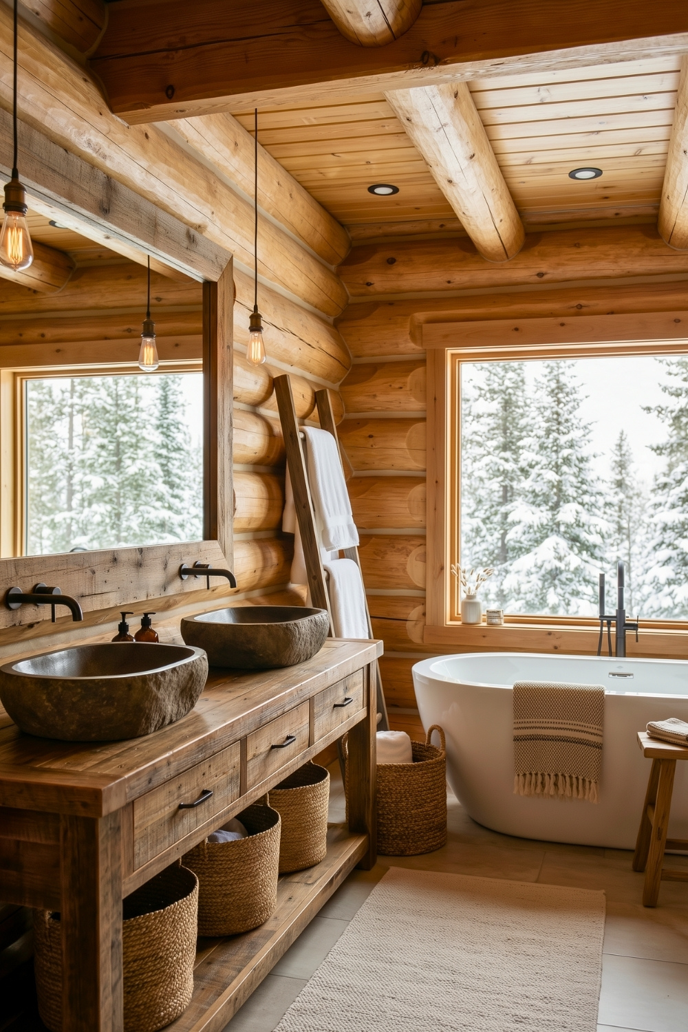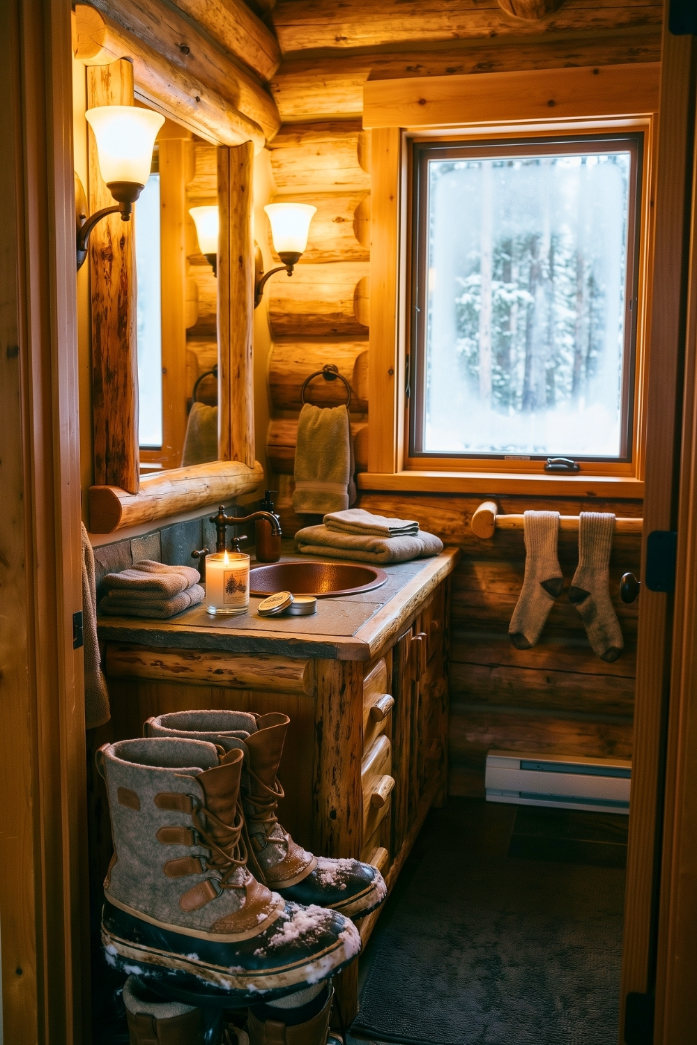 This specific setup captures that “winter in the mountains” feeling perfectly, especially with the snowy forest view framed right outside the window. I love seeing practical touches like a simple towel rack or heavy winter boots left by the vanity, as it makes the log cabin aesthetic feel genuinely lived-in and soulful. It’s a great reminder that the best decor is often a mix of your favorite things and the nature surrounding your home.