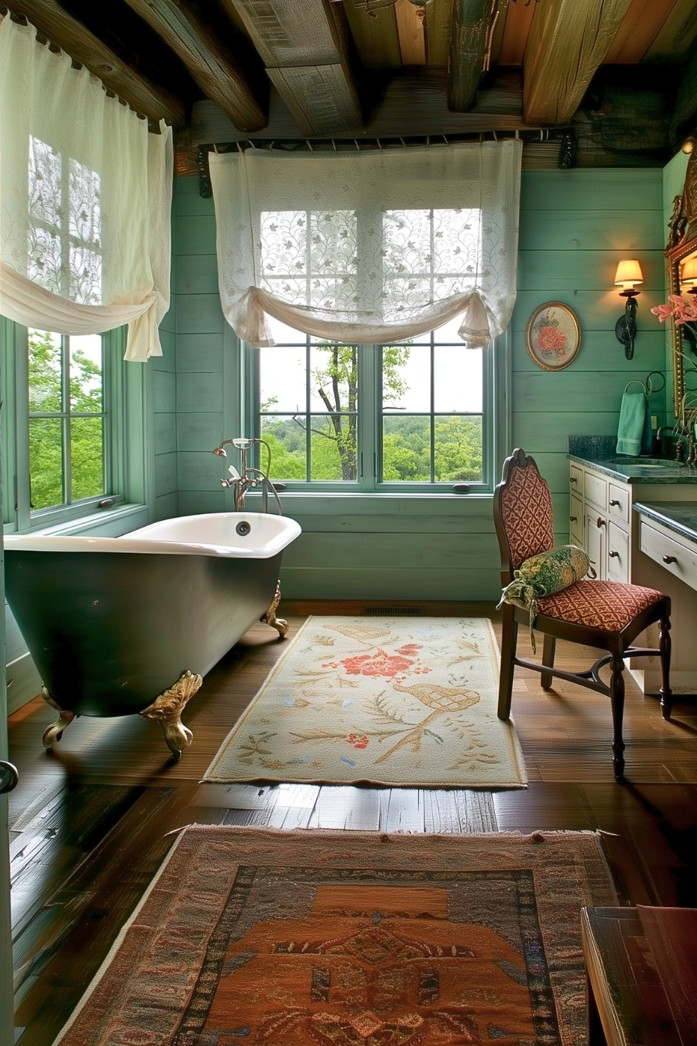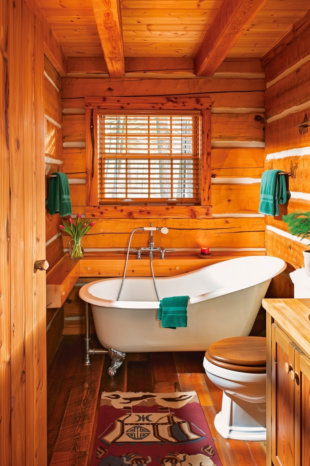 There’s also something especially comforting about a bathroom that prioritizes soft lighting and unpretentious rustic details. By pairing a vintage tub with raw wood walls and subtle decor, you can achieve a relaxed farmhouse vibe that feels lived-in rather than staged. It’s exactly the kind of guest bathroom that stays with you long after you’ve left the cabin.