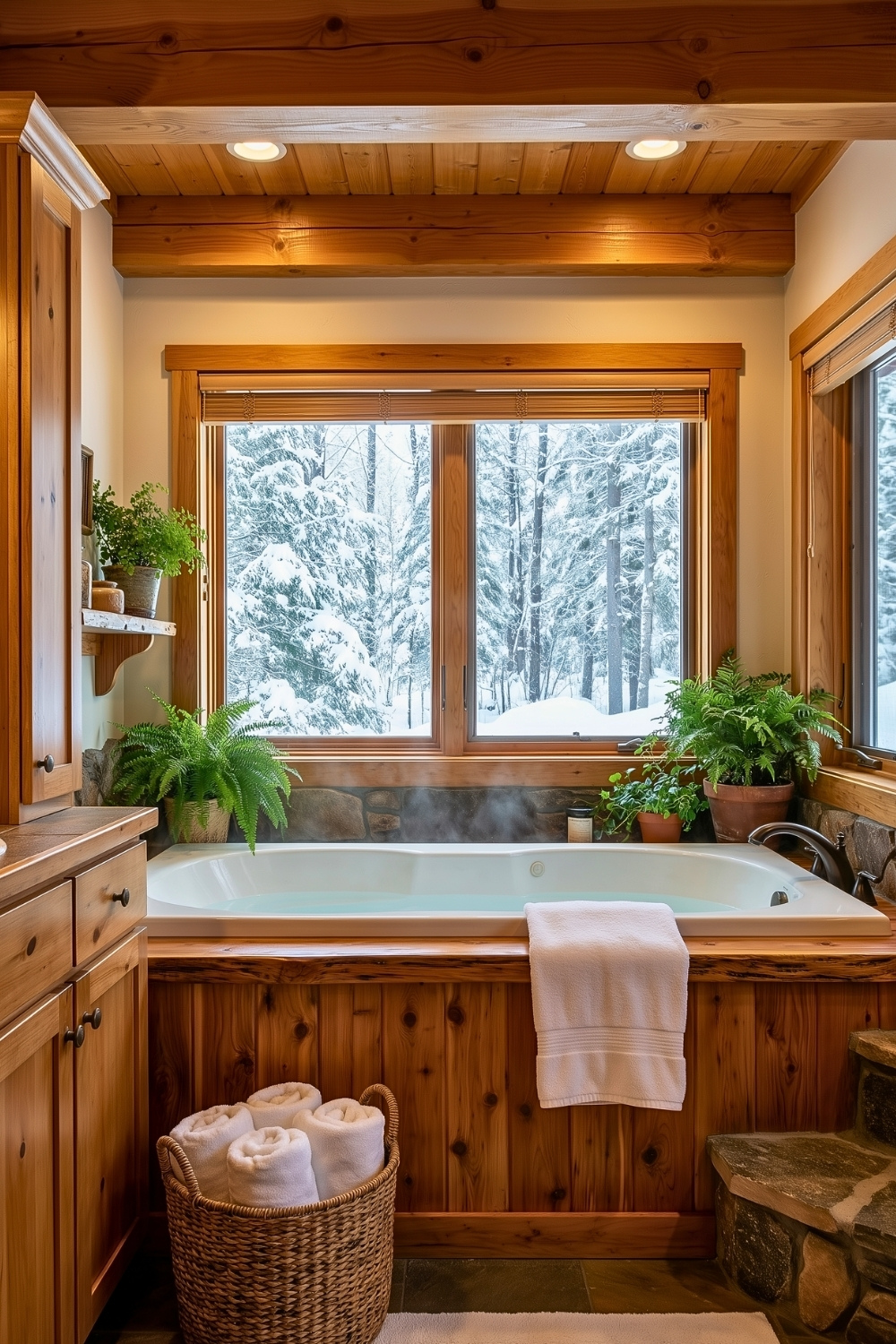 For a master bathroom renovation, sometimes the most impactful choice is a simple white tub surrounded by warm, honey-toned wood. I can easily imagine sitting here and watching the snowfall through that massive window, as the soft color palette and steam create a quiet, meditative space. It just goes to show that when your view is this good, the rest of your design can stay minimal and still feel like a total luxury.