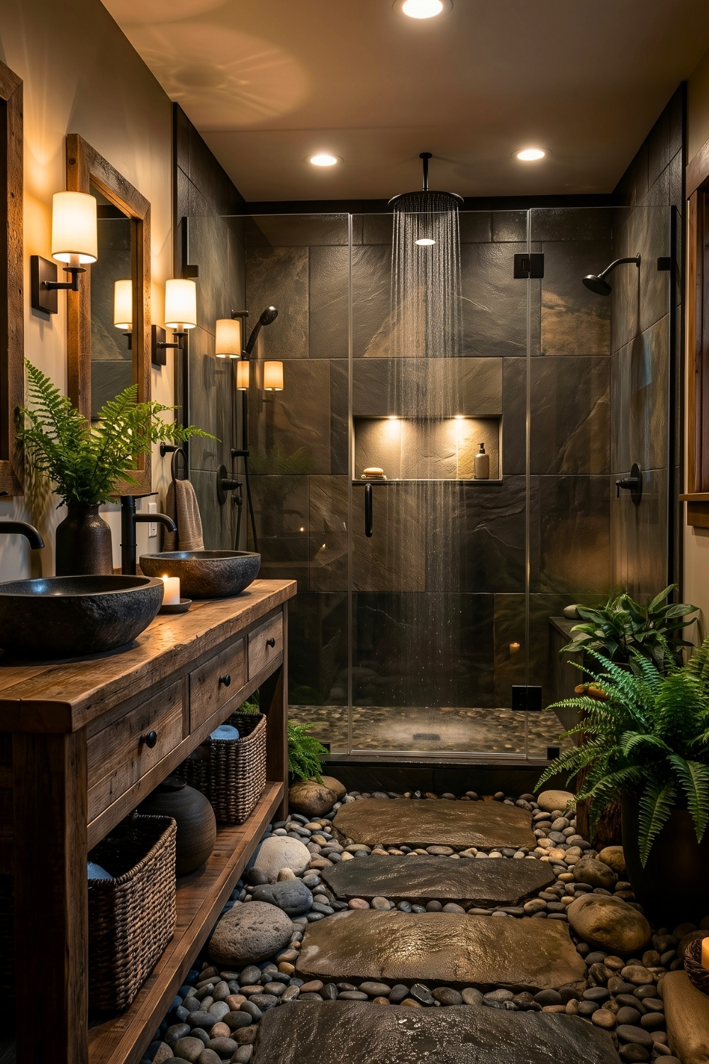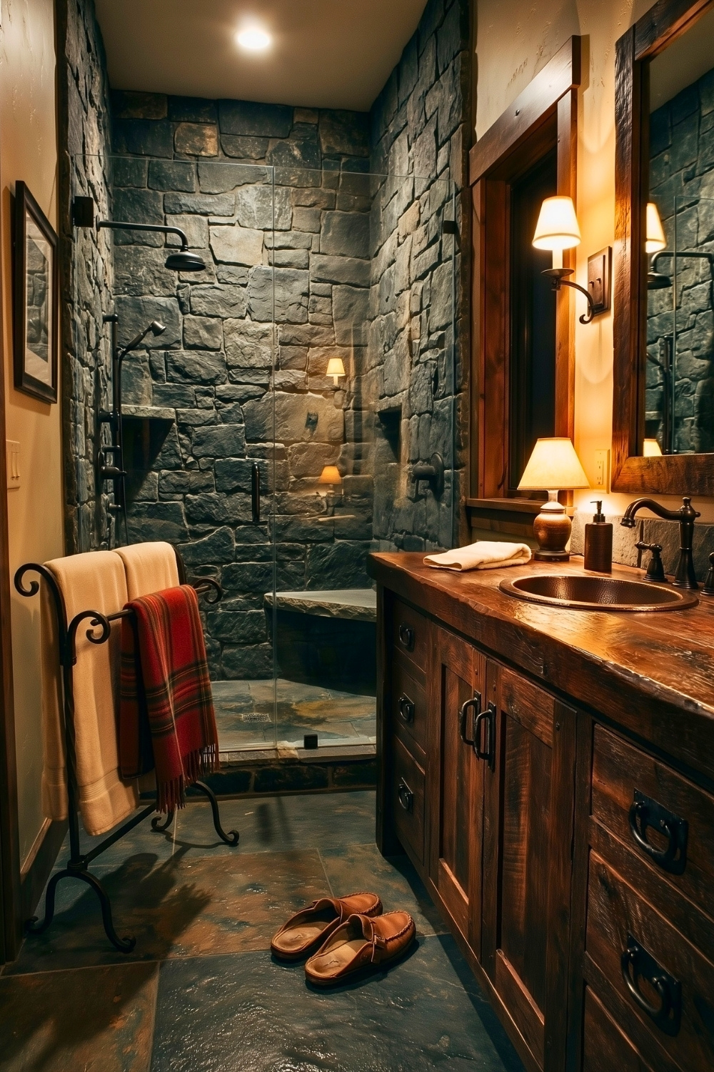 To me, nothing beats the moody, hunting lodge character of a dark stone shower paired with a deep copper sink. I find that using slate floor tile and heavy wood vanities creates a grounding interior that feels both rugged and incredibly high-end. It is the perfect design for a master bath where you want to shut out the world and lean into those mountain retreat vibes.