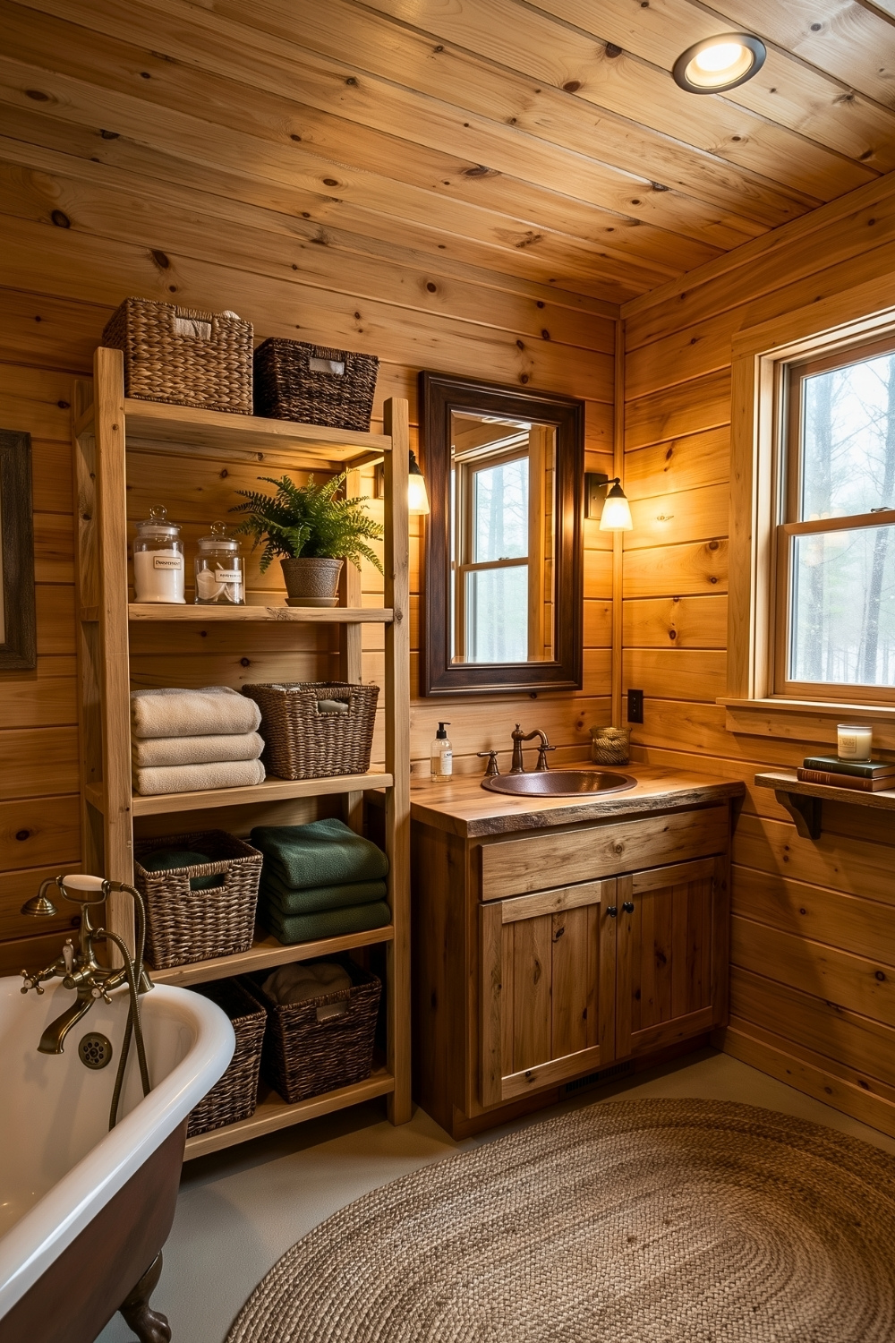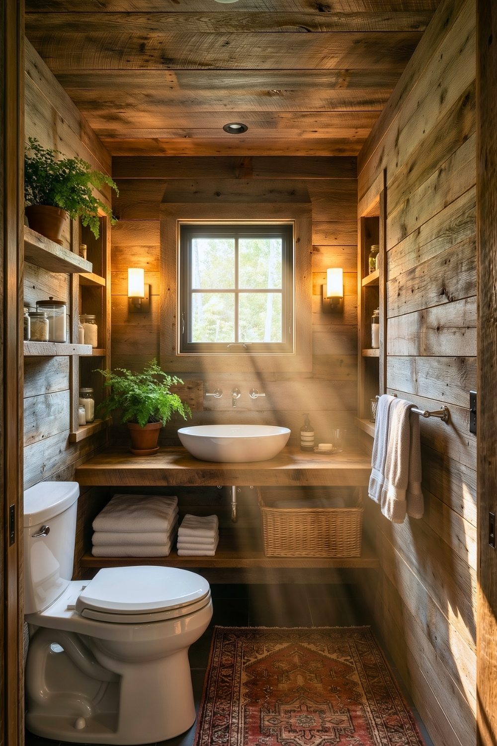 What really makes this cozy cabin bathroom work for me is how intentional the storage feels without overwhelming the space. The open wood shelves, simple vanity sink, and folded towels create a calm, functional design that’s perfect for a small cabin interior. It’s the kind of layout that proves you don’t need a full remodel to make a bathroom feel warm, organized, and deeply inviting.